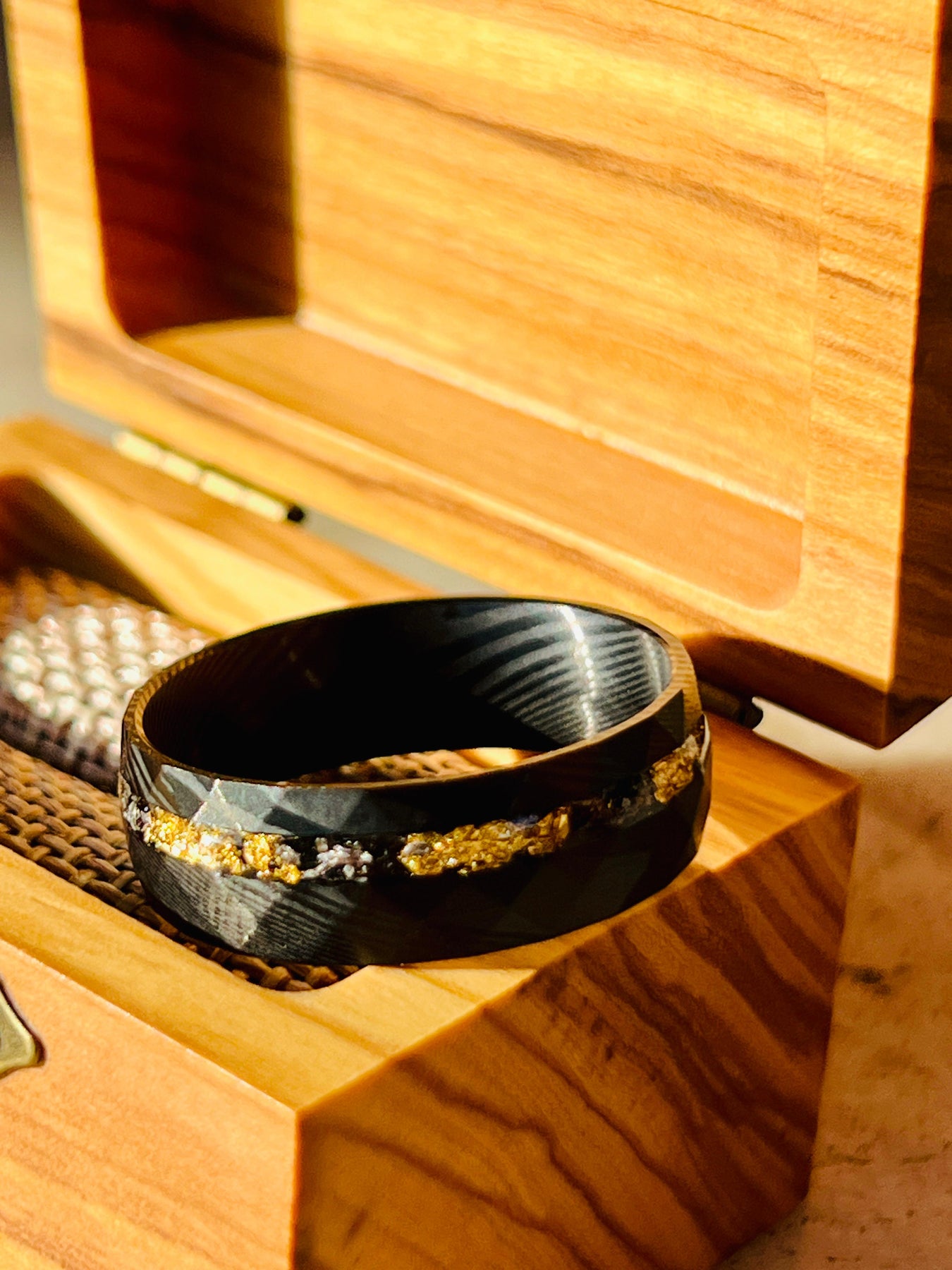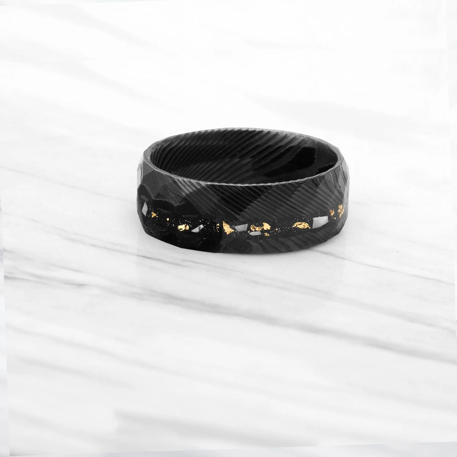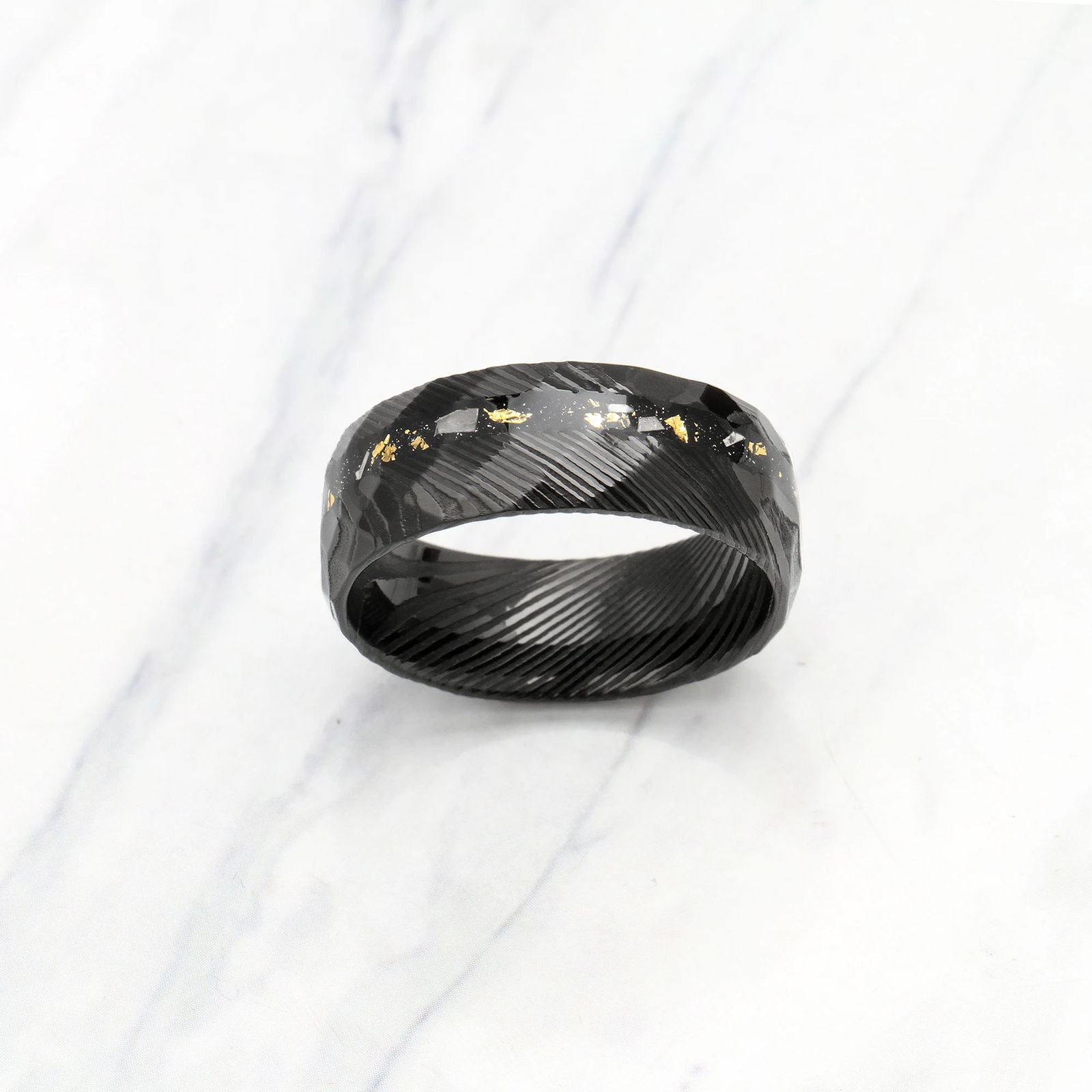 Discover the perfect blend of simplicity and uniqueness with our Handcrafted Damascus Meteorite Wedding Band. This exquisite ring features a distinctive rock-hammered finish that encircles the band, complemented by a sleek polished look and a touch of crushed gold leaf. Ideal for those seeking a one-of-a-kind piece, this band offers a minimalist yet striking aesthetic.