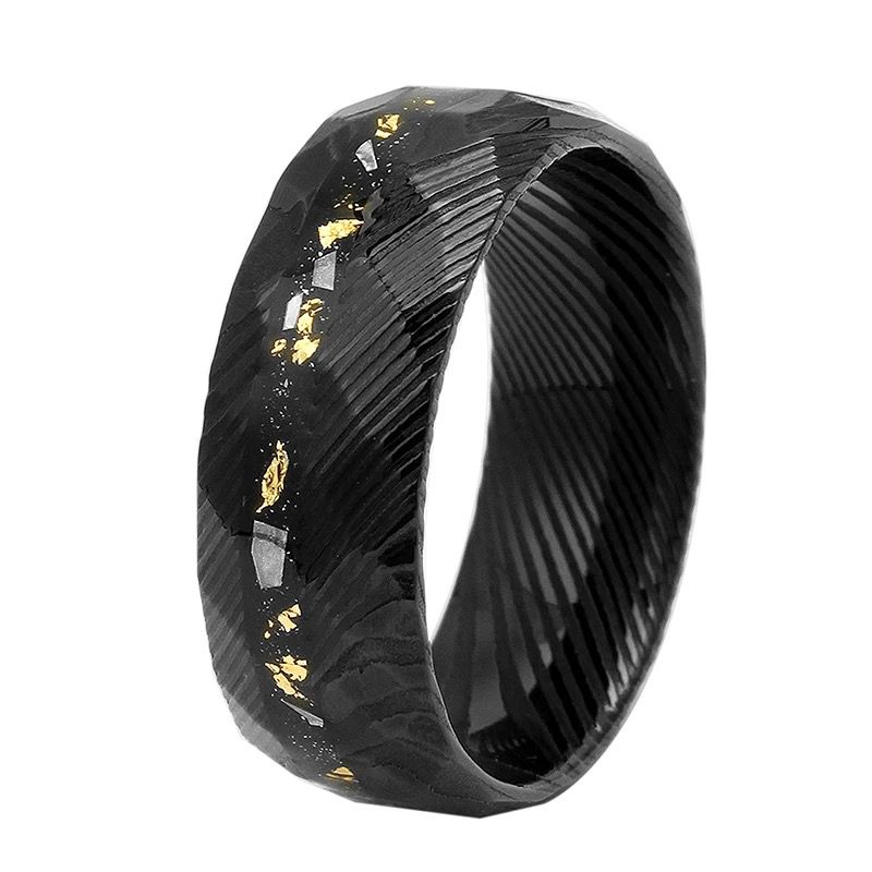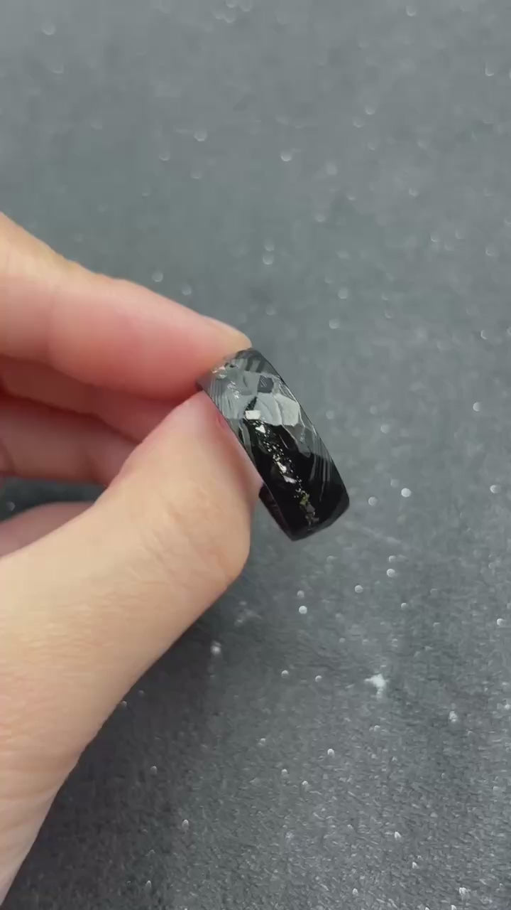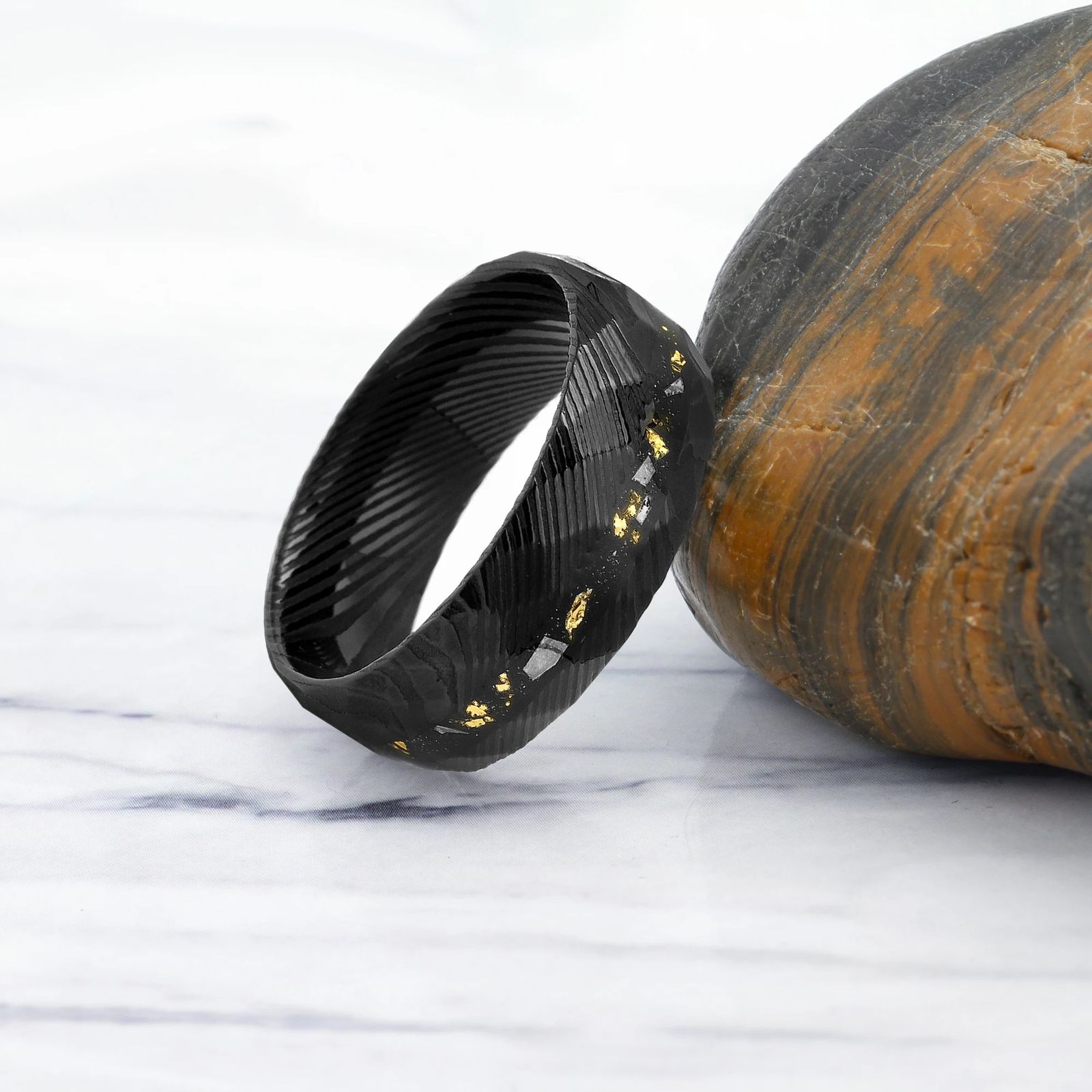 Discover the perfect blend of simplicity and uniqueness with our Handcrafted Damascus Meteorite Wedding Band. This exquisite ring features a distinctive rock-hammered finish that encircles the band, complemented by a sleek polished look and a touch of crushed gold leaf. Ideal for those seeking a one-of-a-kind piece, this band offers a minimalist yet striking aesthetic.