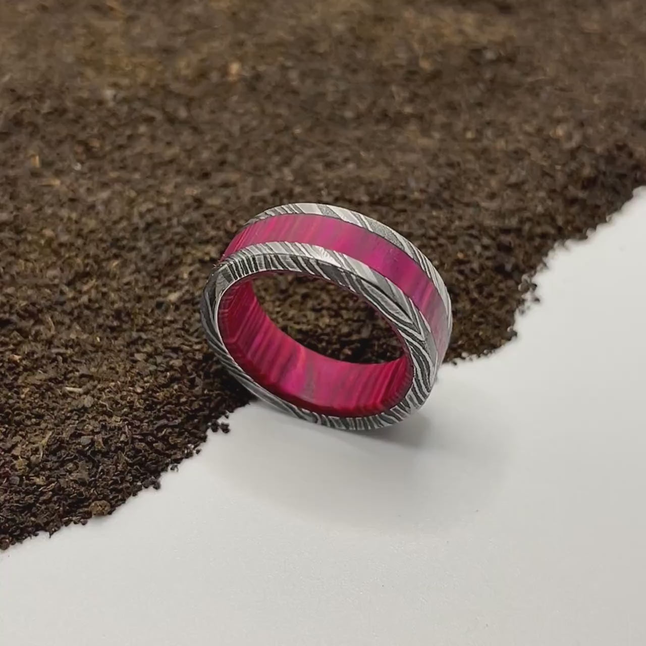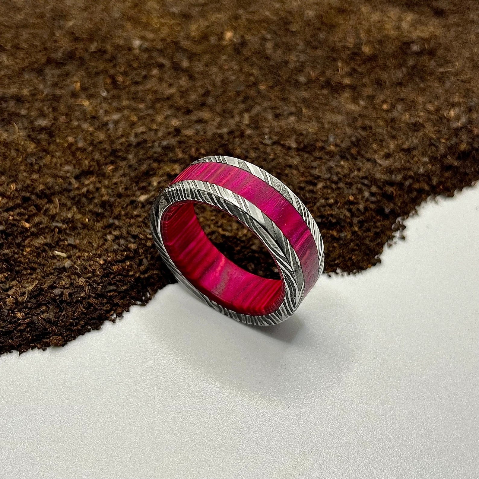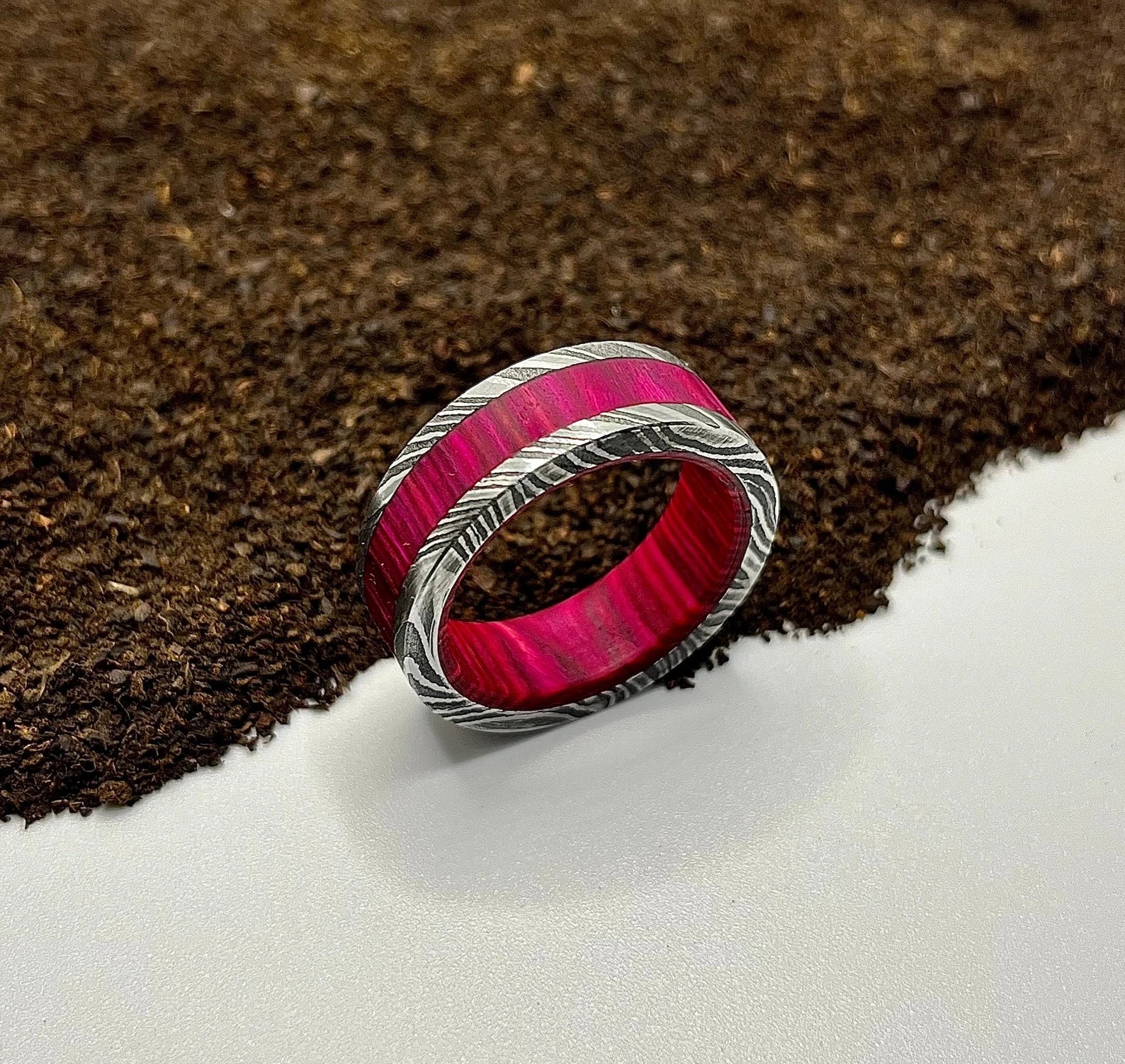 Damascus Ring Lined with Wide Pinkish Wood Sleeve - RustyStudioUSA