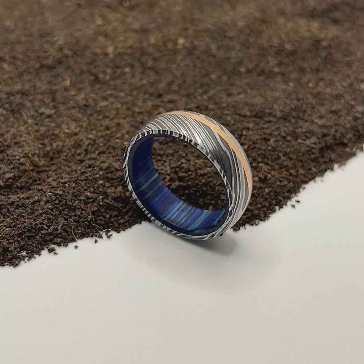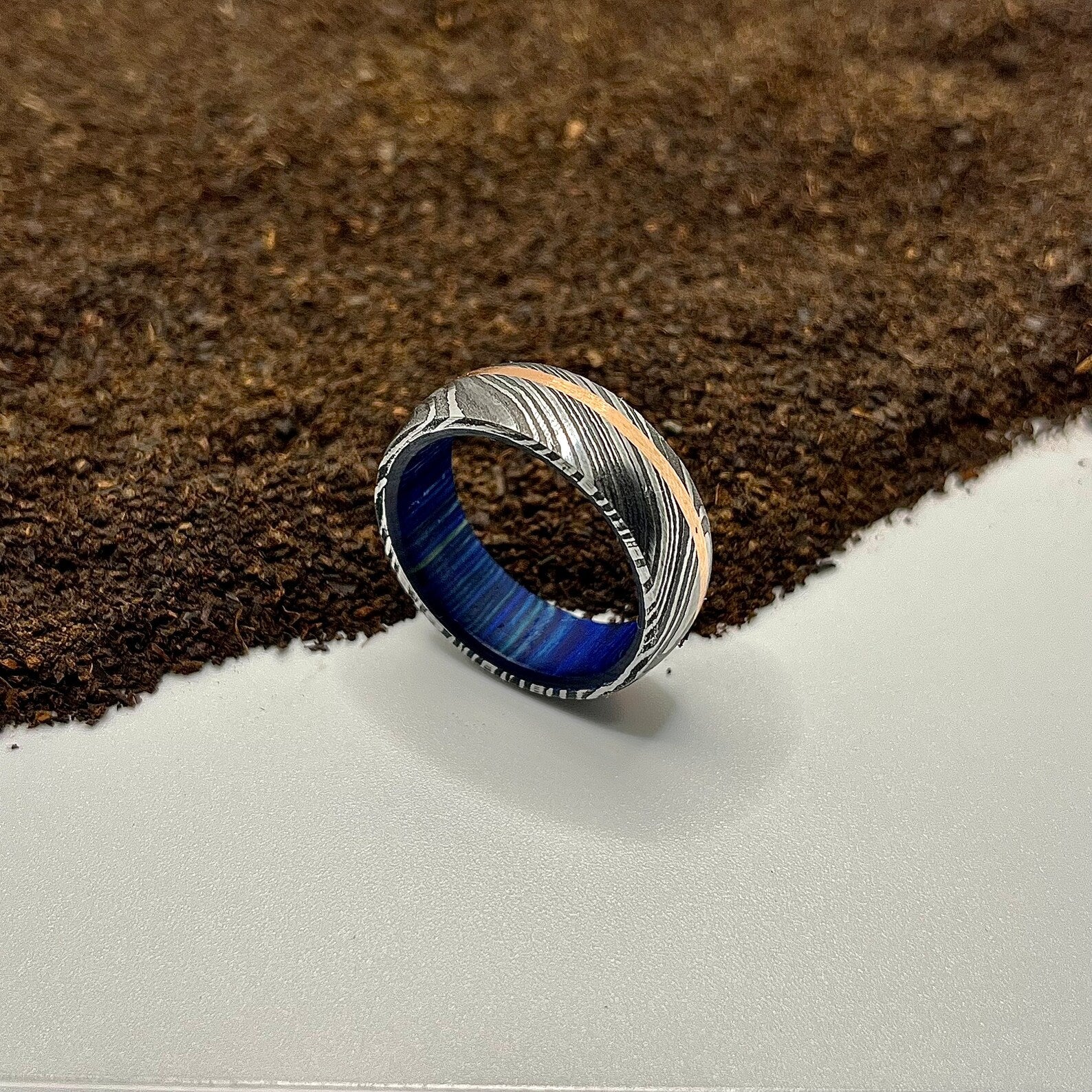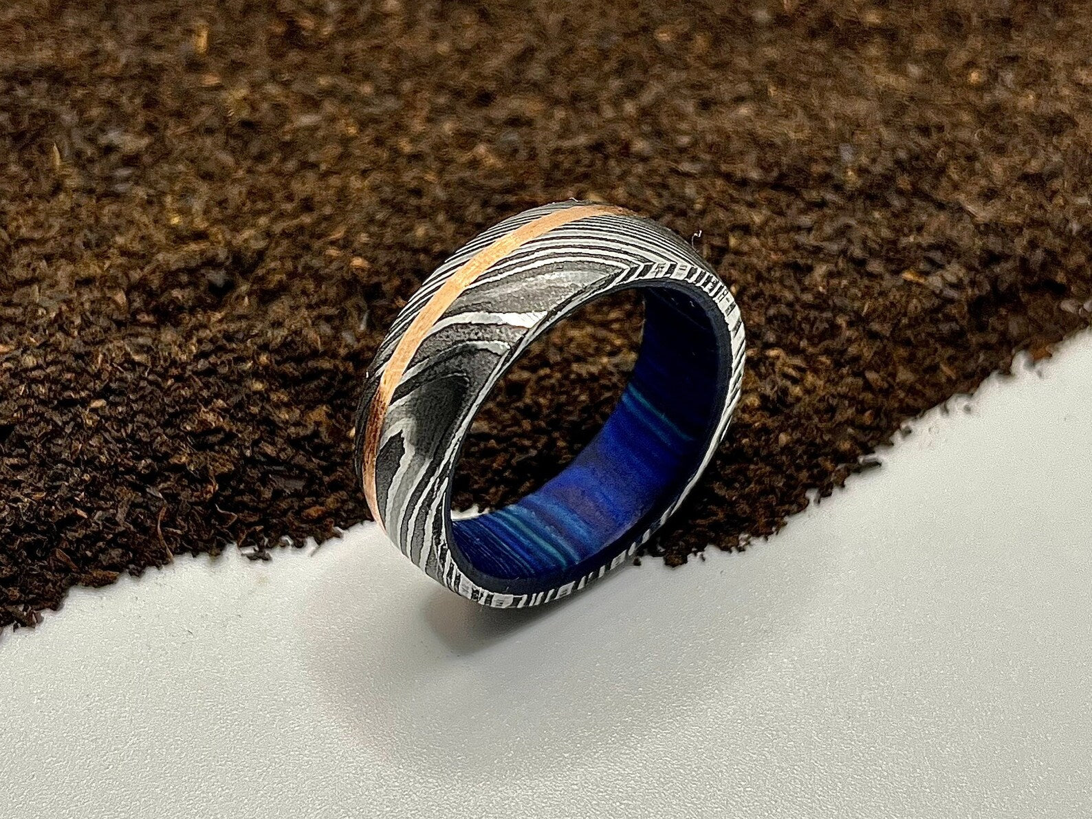 The interior of this Damascus steel ring is lined with a hardwood sleeve. The exterior of the ring has an off-centered copper inlay to add a premium look to it.