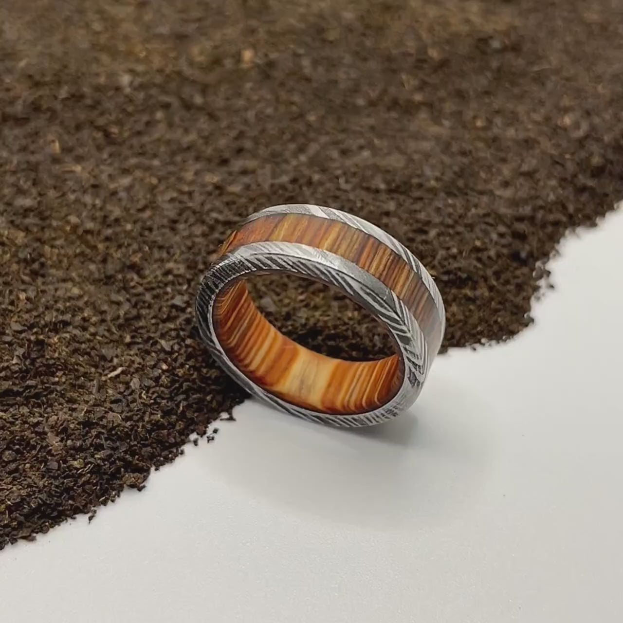 Handmade Black Damascus Steel Ring with Hardwood Sleeve | Unique Rustic Design