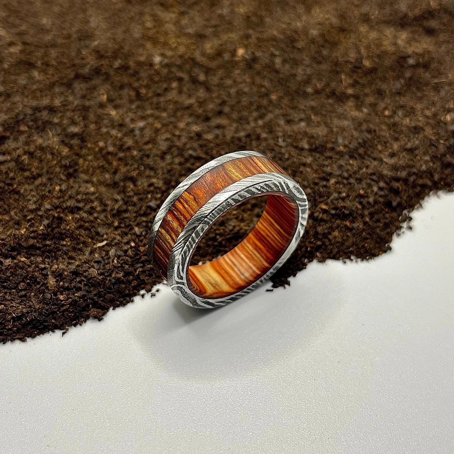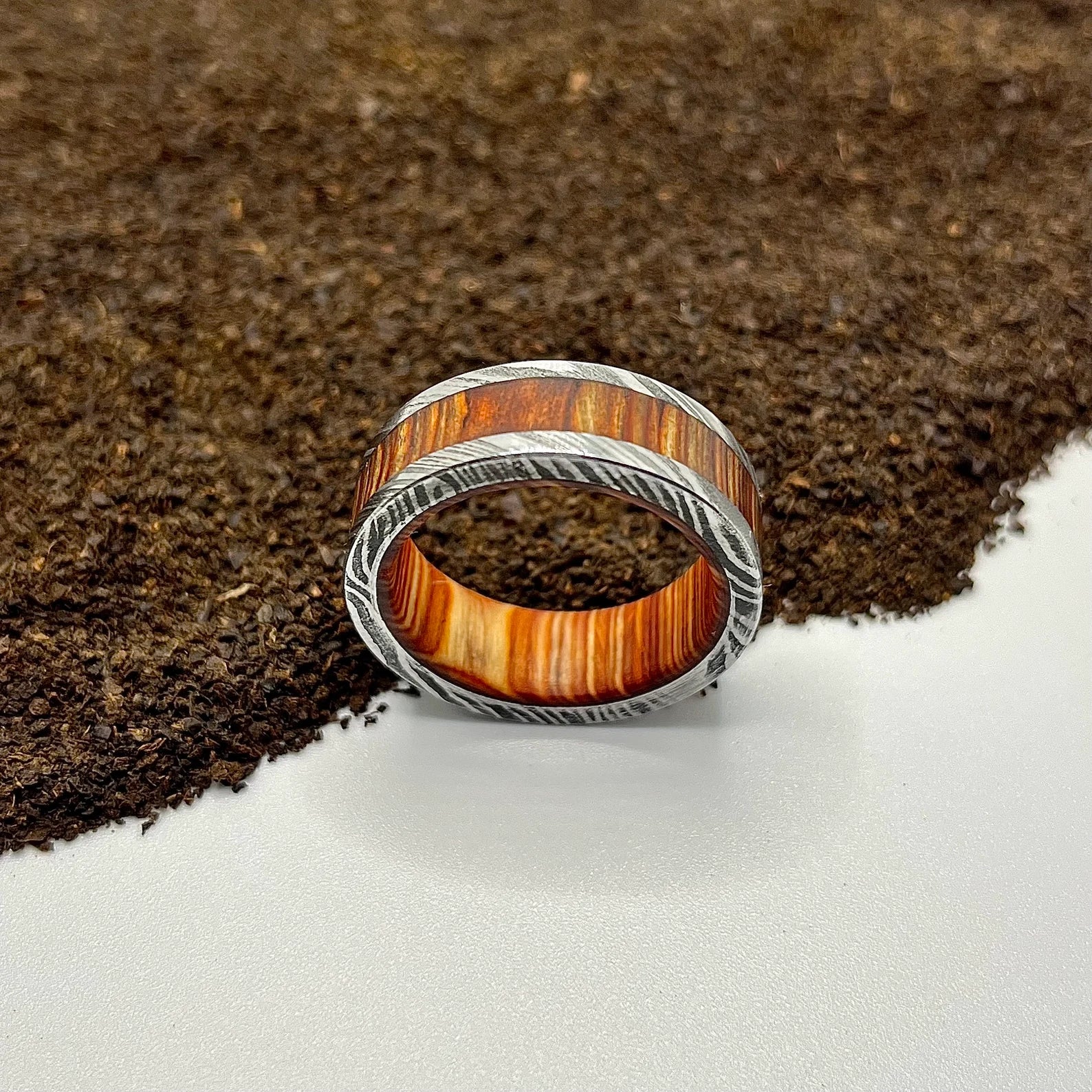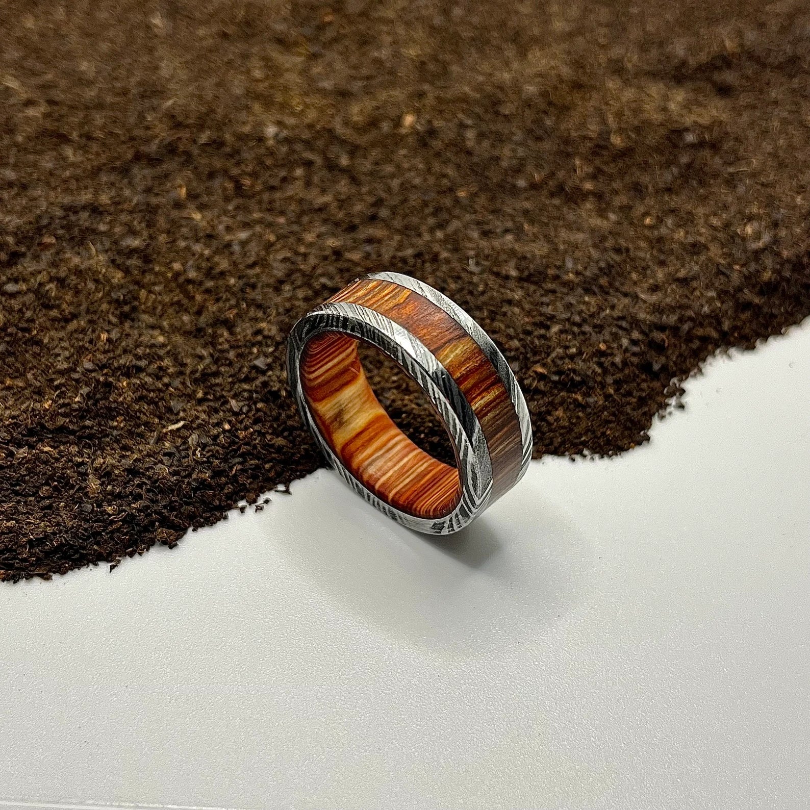 Handmade Black Damascus Steel Ring with Hardwood Sleeve | Unique Rustic Design - RustyStudioUSA