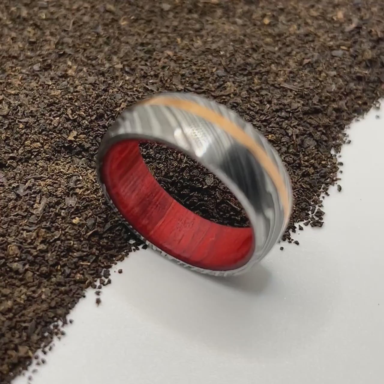The interior of this damascus steel ring is lined with a hardwood sleeve. Hardwood used in this ring is 100% natural and skin friendly. If you want a ring that will stand out, this band is your one stop shop because it offers a unique but simplistic aesthetic. The appealing design has a sleek polished finish.