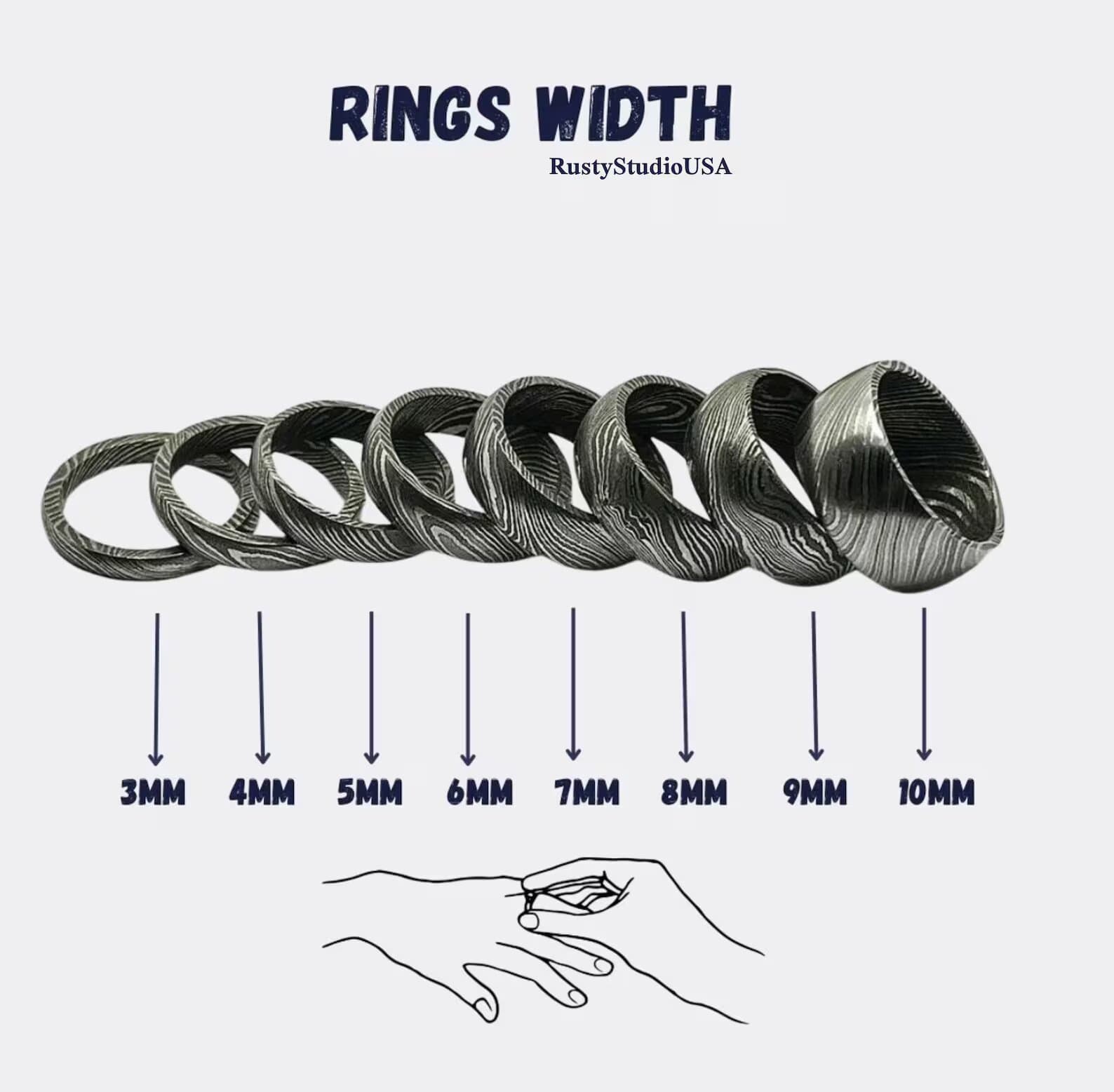 Please be aware that due to the handcrafted nature of Damascus rings, variations in colour, shade, and pattern can be slightly different. Each ring is meticulously made to order, resulting in unique characteristics that make every piece one-of-a-kind. As such, no two rings can be identical, adding to the charm and individuality of each creation.