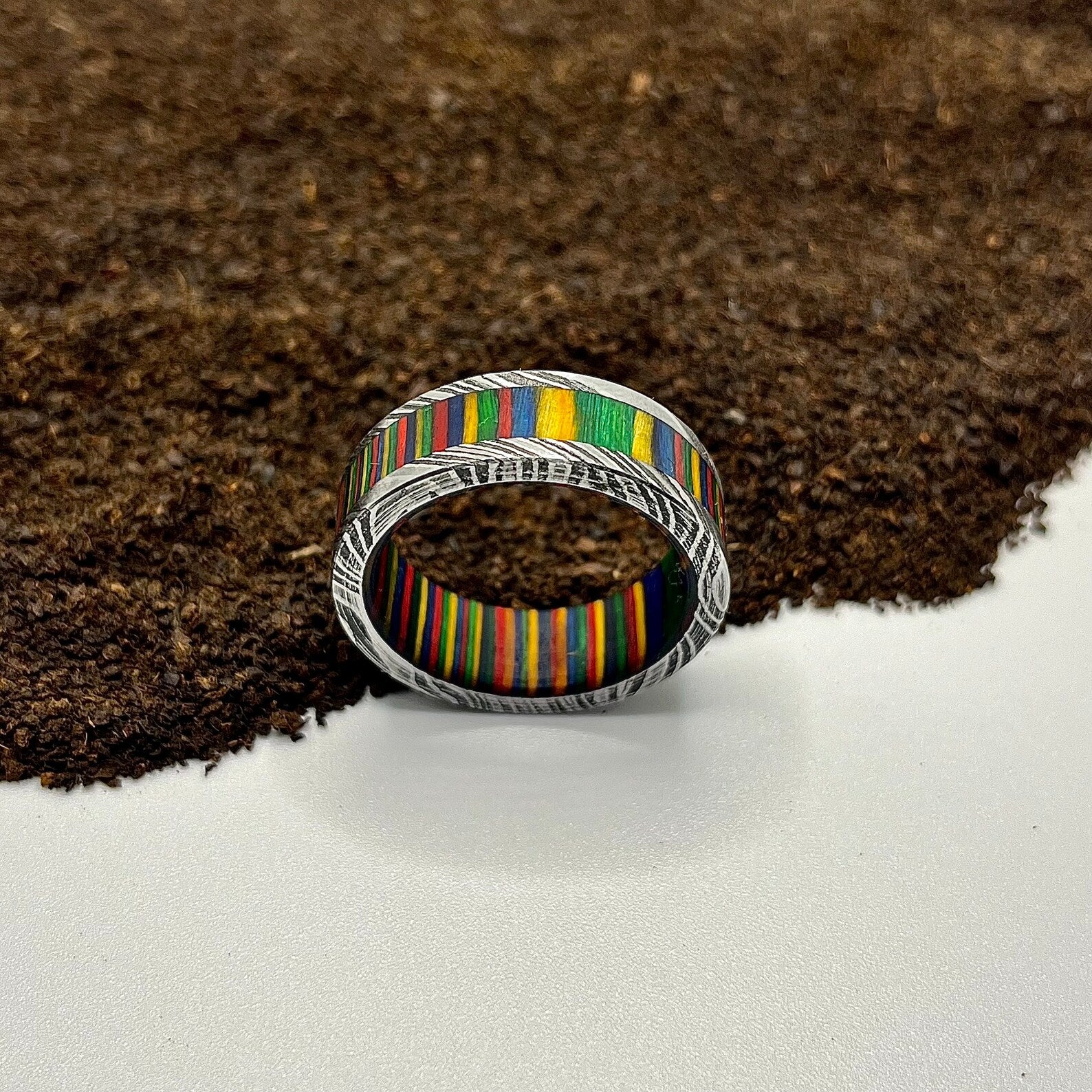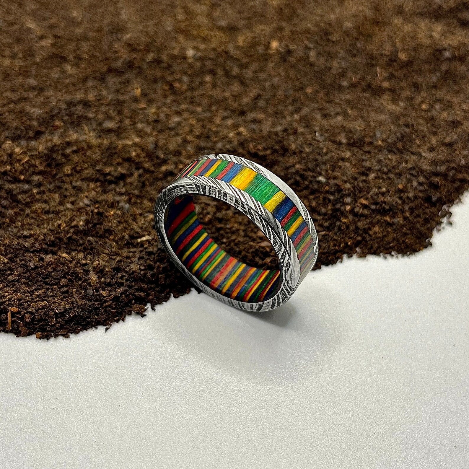 Damascus Steel Ring Lined with Wide Rainbow Wood Sleeve