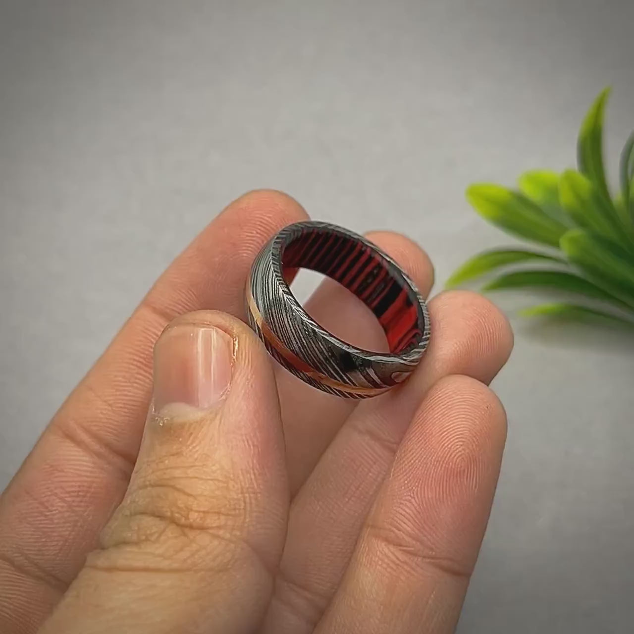 Looking for a bold and exclusive men’s wedding band? This Copper Inlaid Damascus Steel Ring is a masterpiece of craftsmanship, combining the raw beauty of hand-forged Damascus steel with a sleek, off-centered copper inlay. The interior features a smooth, hardwood sleeve, ensuring a comfortable fit while adding a natural touch to this striking design.