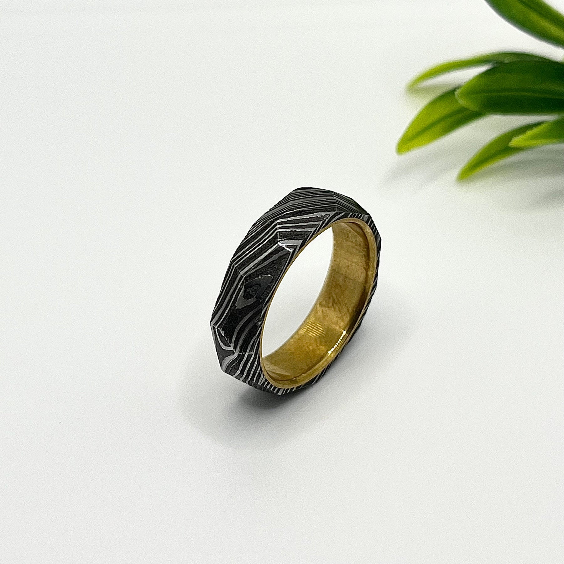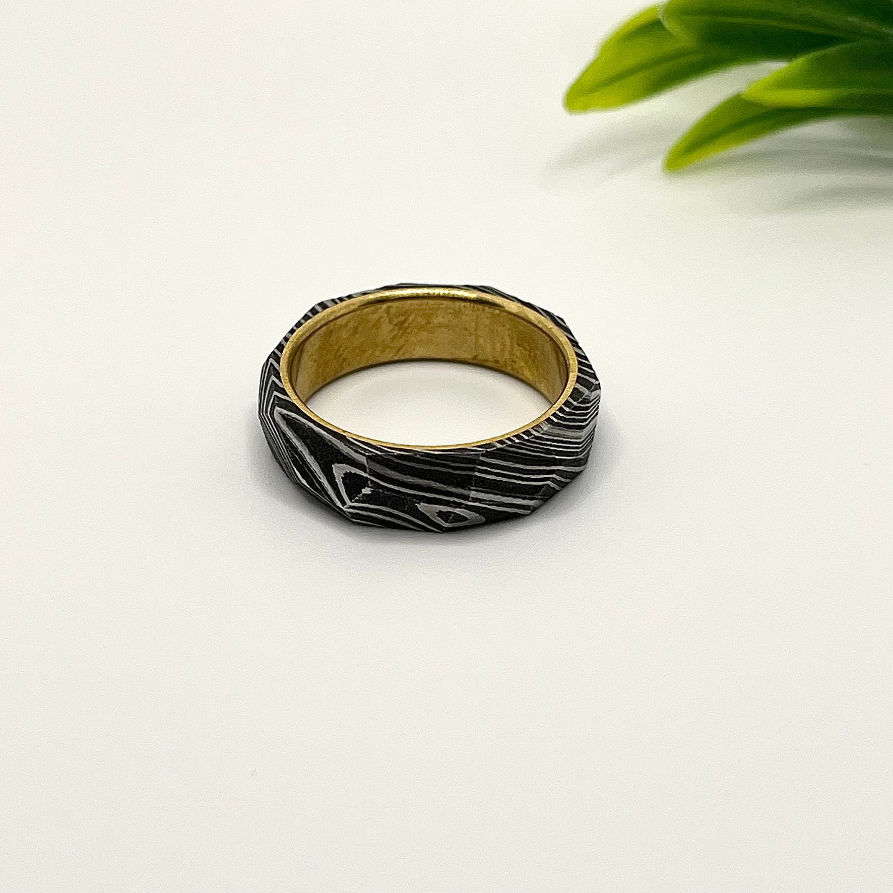 Elevate your style with this stunning handmade Damascus steel rock hammered ring featuring a brass sleeve. The unique patterns and textures of the Damascus steel, combined with the warm golden hues of the brass, make for a striking and stylish contrast. Perfect as a men's wedding band, engagement ring or fashion accessory, This ring is not only fashionable but also durable and comfortable to wear. The handcrafted design ensures that each ring is one-of-a-kind, making it a truly special piece of jewelry to treasure for years to come. With its timeless design and high-quality materials, this ring is sure to become a staple in your collection.
