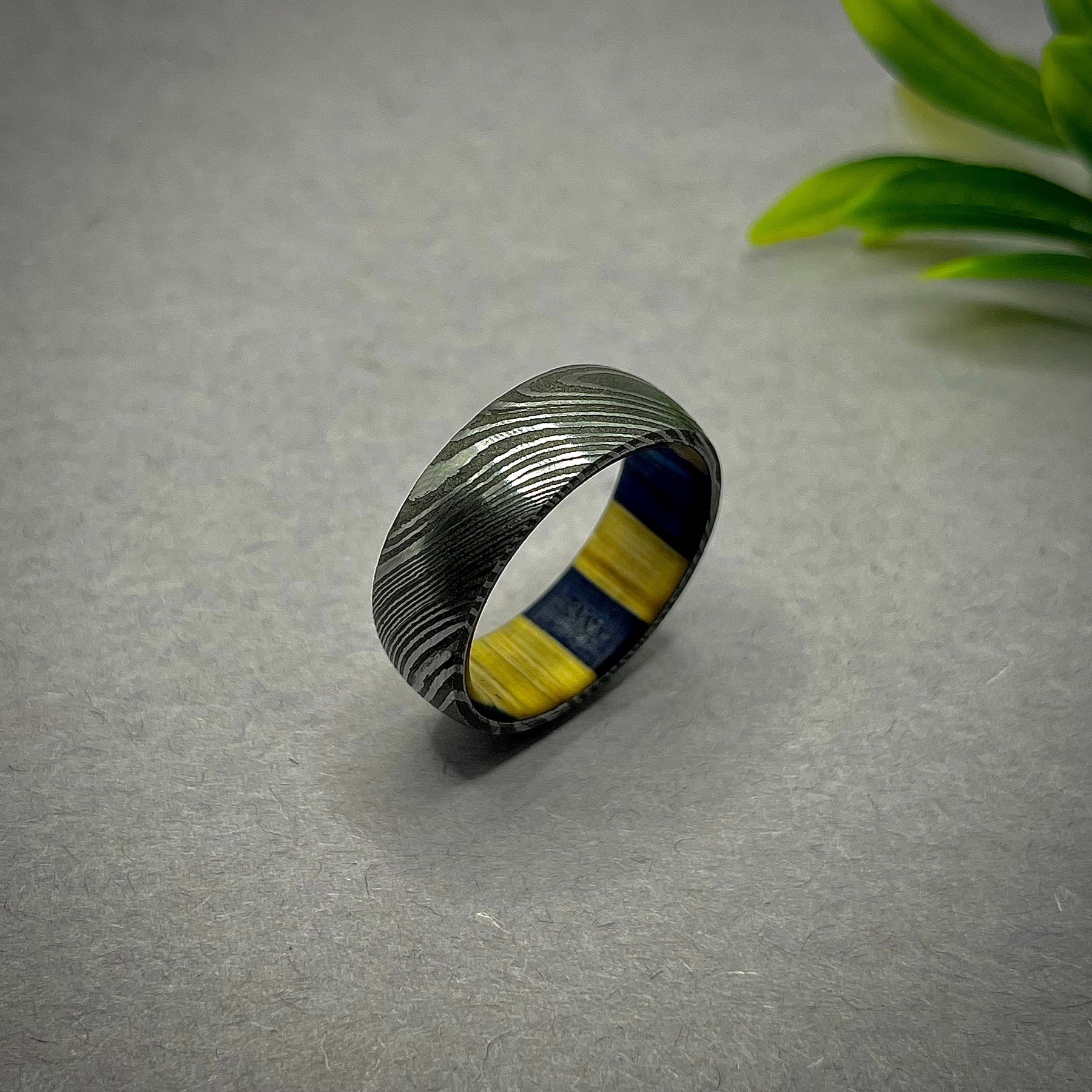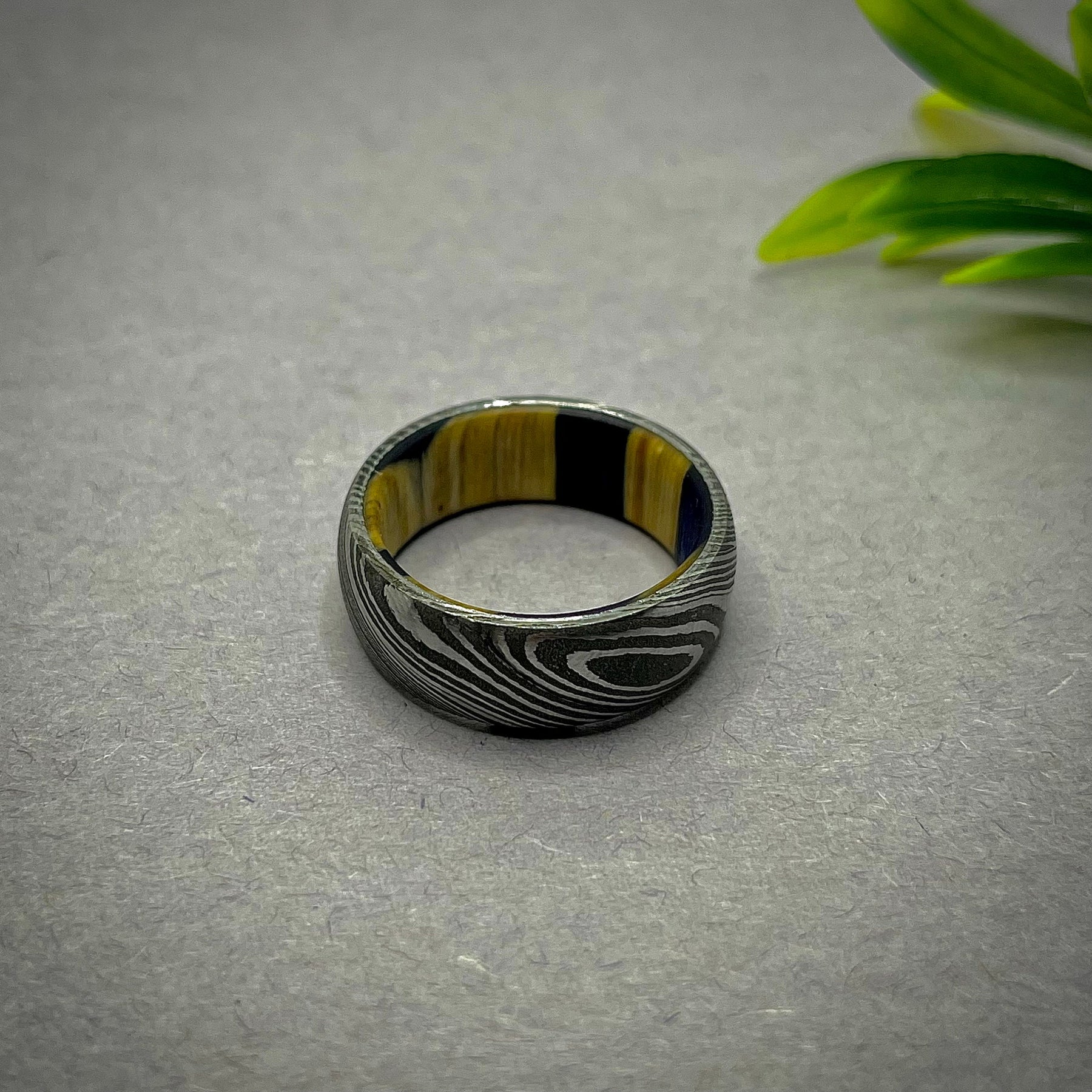 A premium & unique ring made of expensive Damascus steel. The interior of the ring is lined with a hardwood sleeve. Hardwood rings are a beautiful combination of natural cut hardwood and custom formed alternative metal. If you’re searching for a simple option, this band offers a unique but simplistic aesthetic. The appealing design has a sleek polished finish.