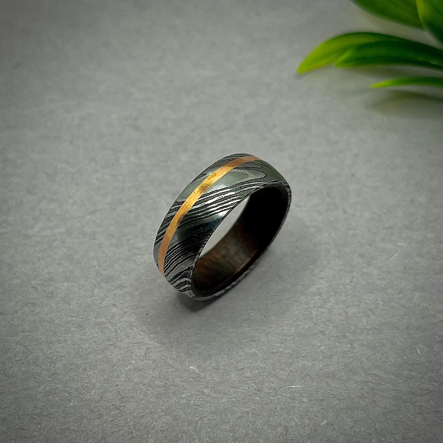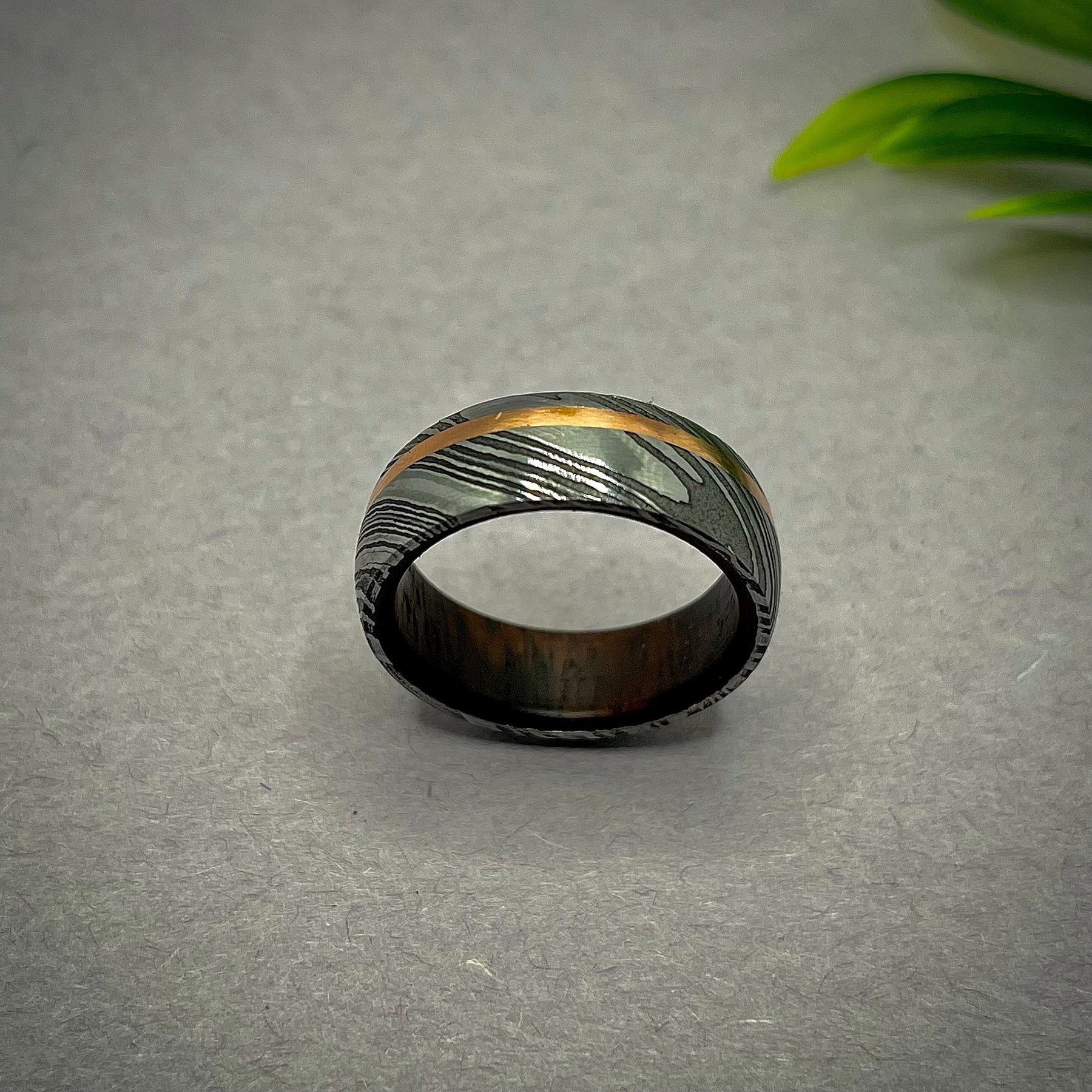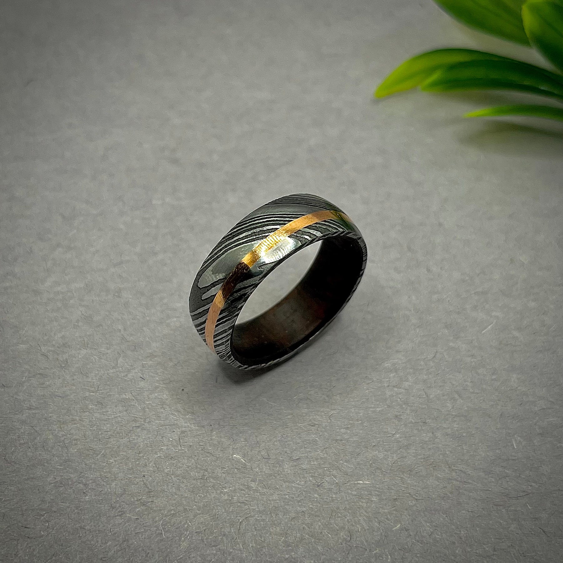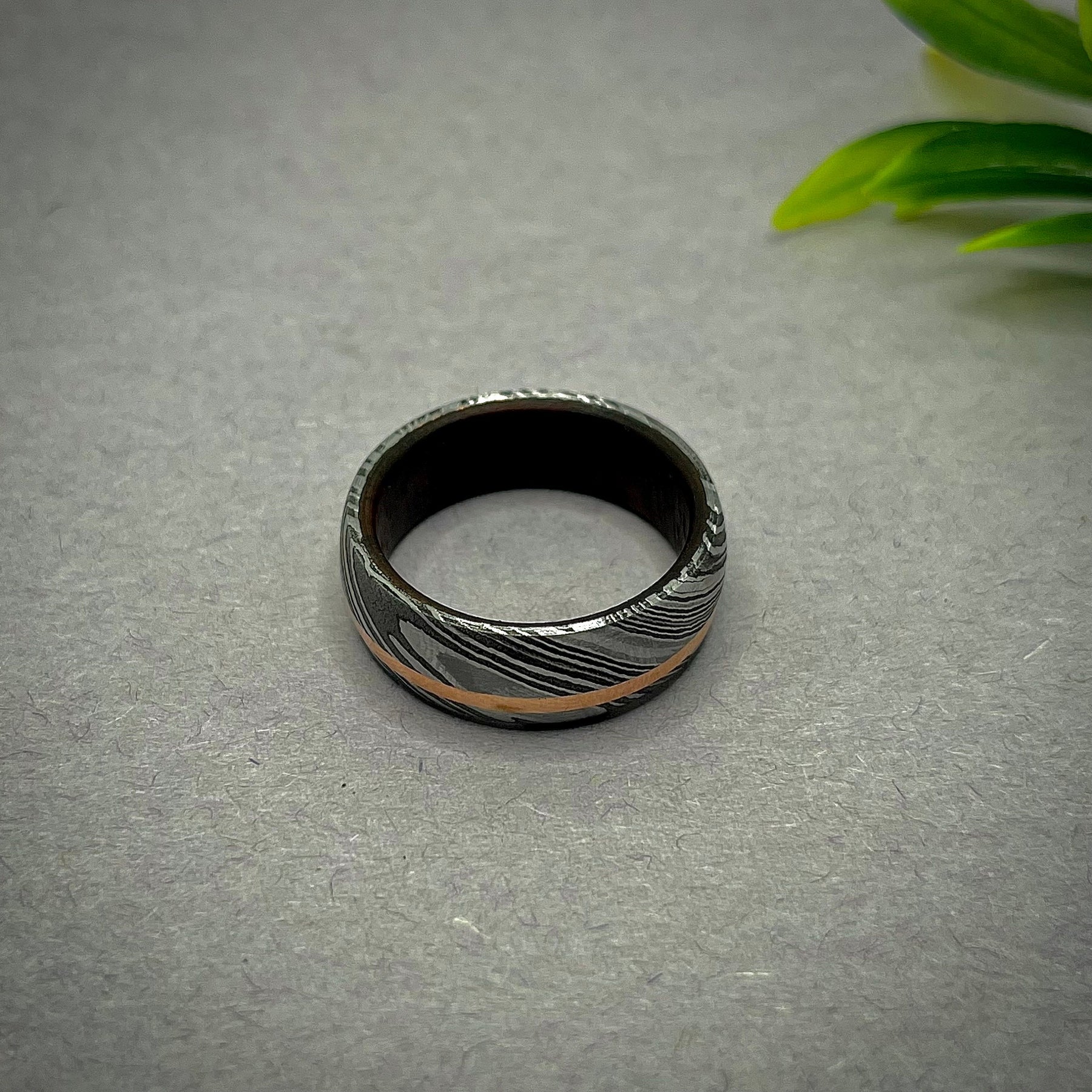 A premium & unique ring made of expensive Damascus steel. The interior of the ring is lined with a hardwood sleeve. Hardwood rings are a beautiful combination of natural cut hardwood and custom formed alternative metal. If you’re searching for a simple option, this band offers a unique but simplistic aesthetic. The appealing design has a sleek polished finish and the sterling off-centered copper inlay adds a little extra pop.