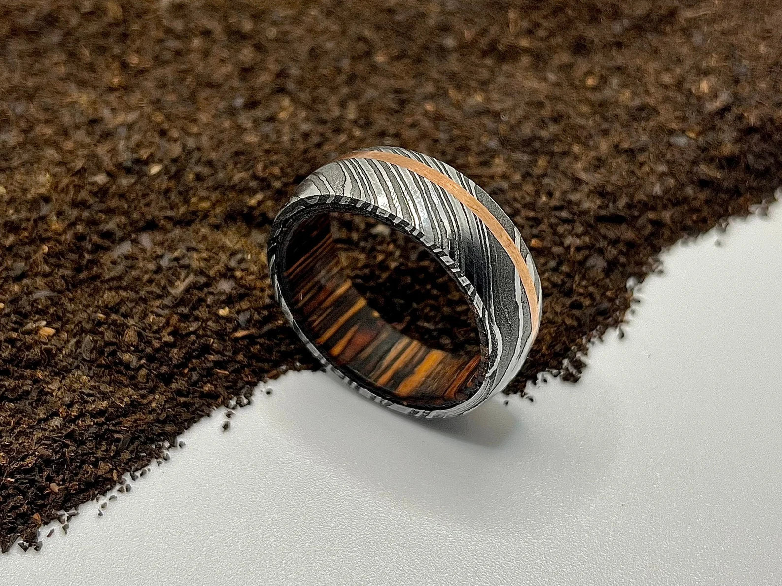 The interior of this damascus steel ring is lined with a hardwood sleeve. Hardwood used in this ring is 100% natural and skin friendly. If you want a ring that will stand out, this band is your one stop shop because it offers a unique but simplistic aesthetic. The appealing design has a sleek polished finish.