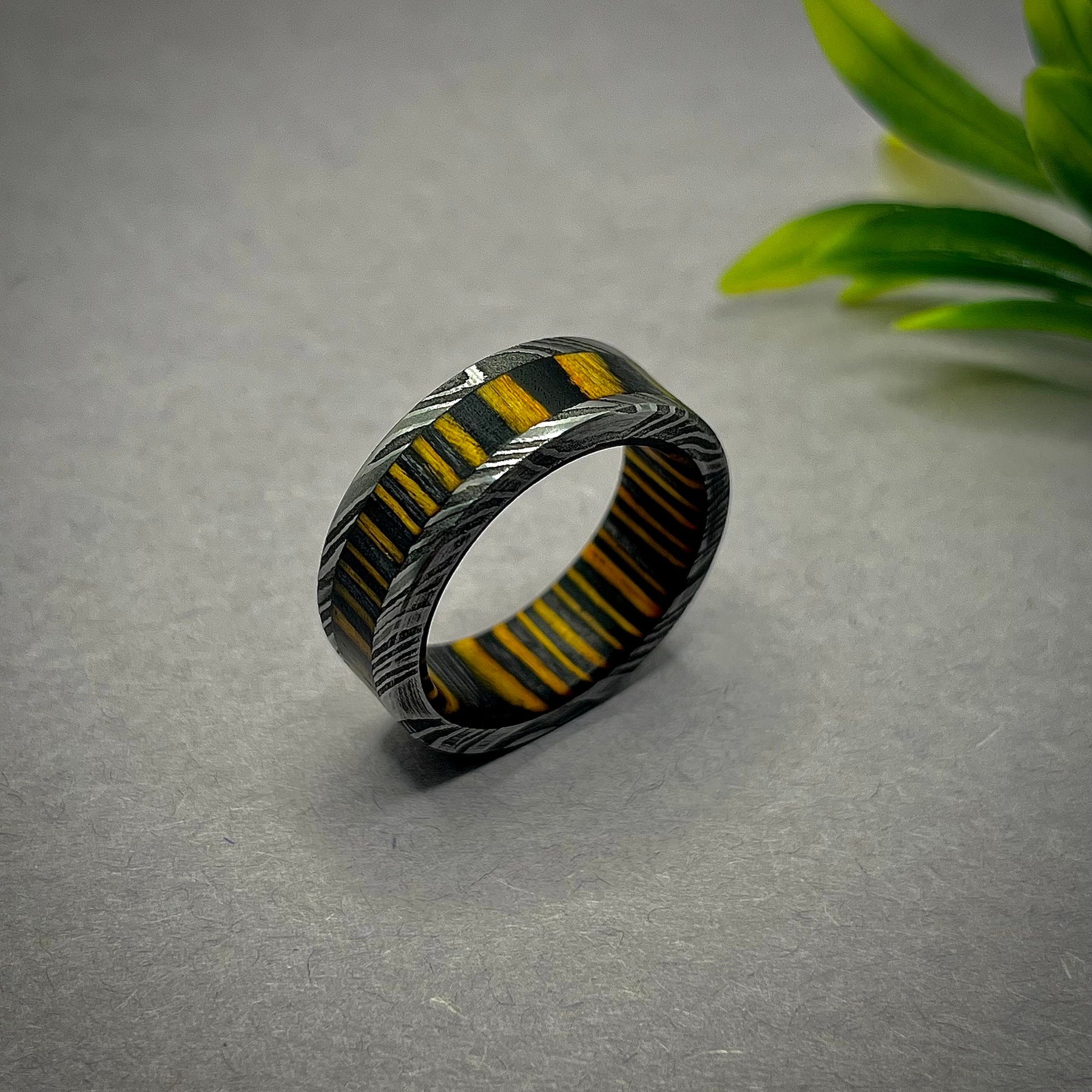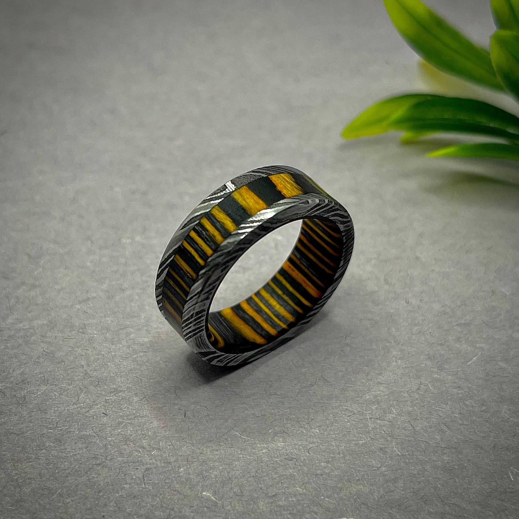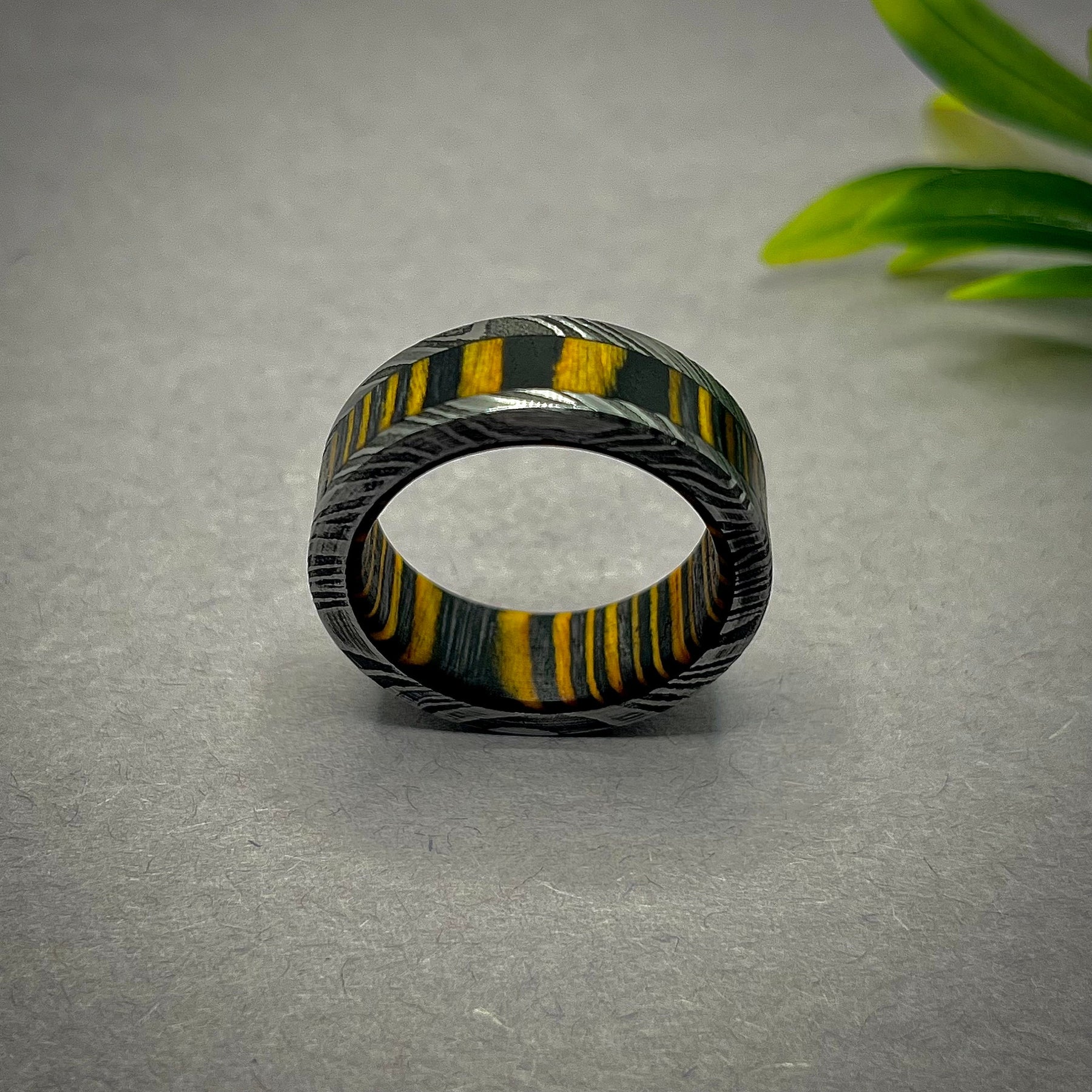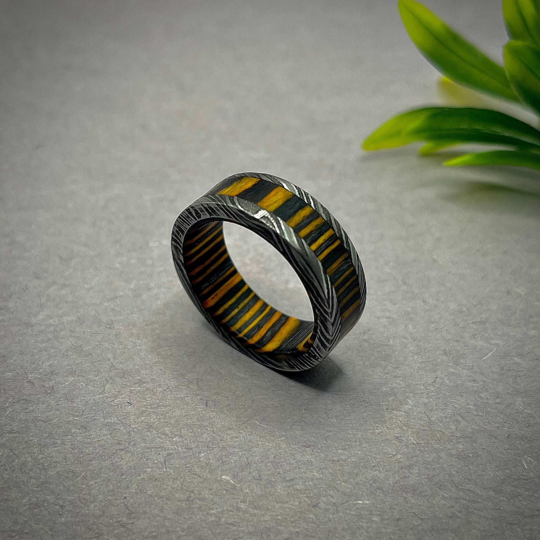 Damascus Steel Ring - Whiskey Barrel Wood Ring Mens Wedding Band - Damascus Ring Wood gold Outer Liner Wedding Band Mens Wood Inlay Ring