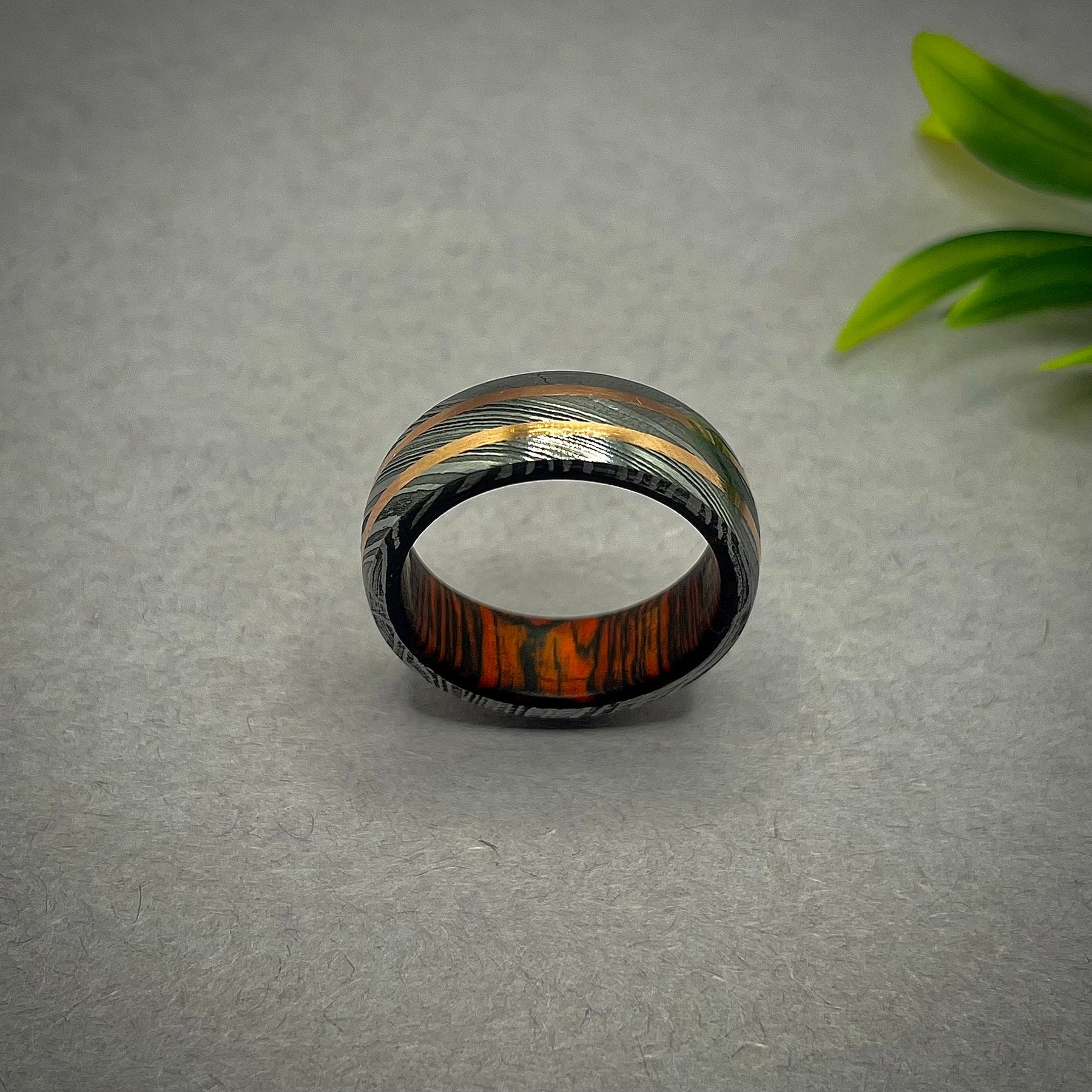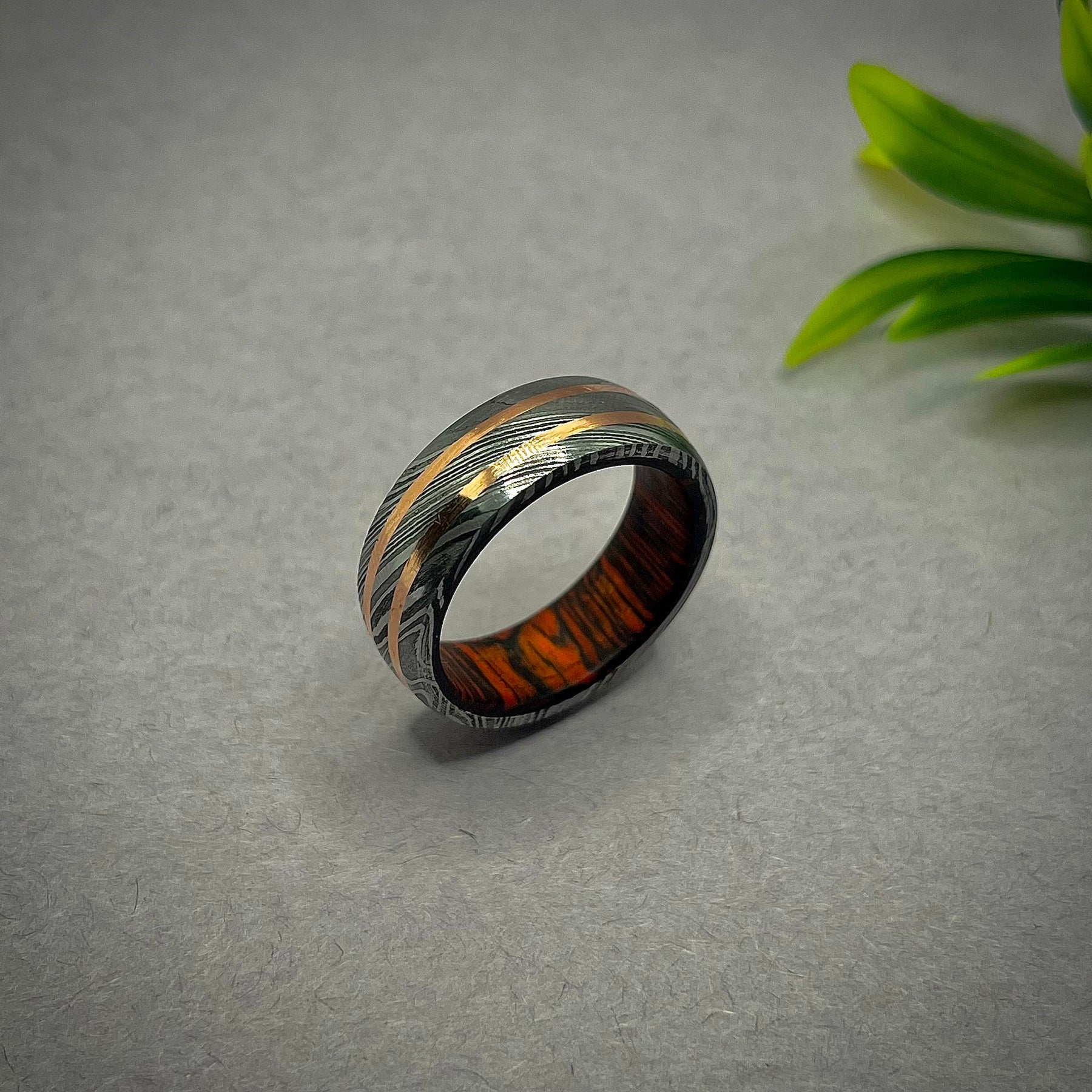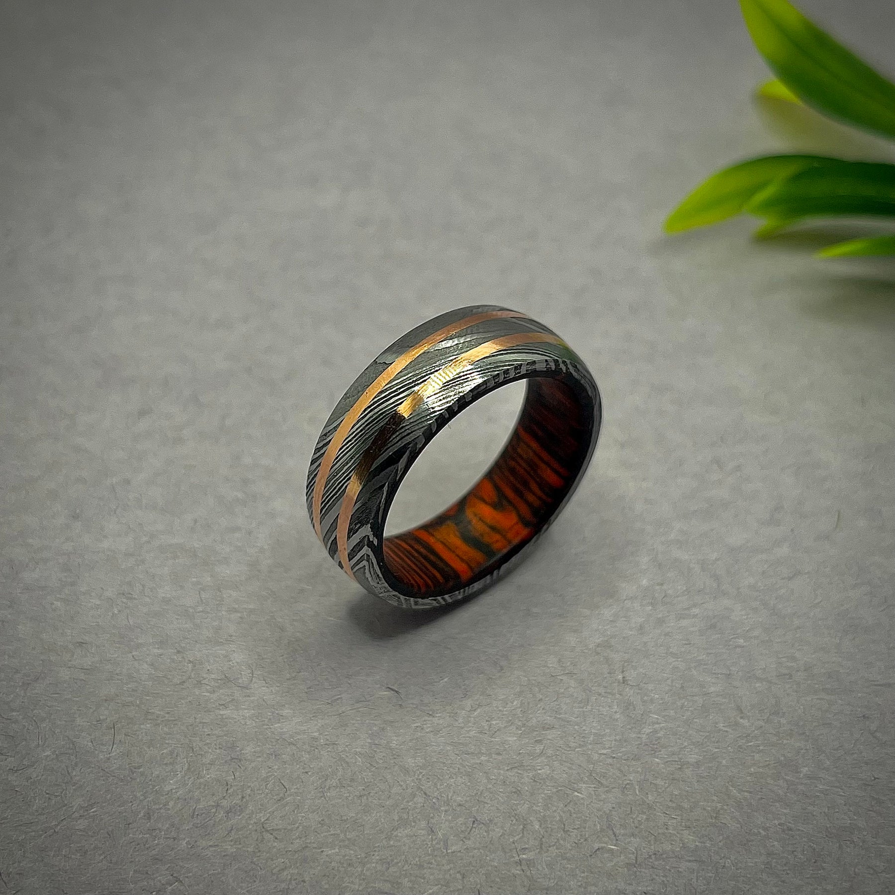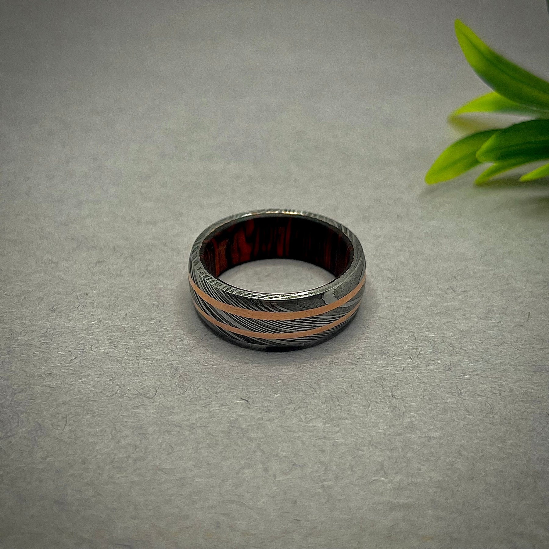 A premium & unique ring made of expensive Damascus steel. The interior of the ring is lined with a hardwood sleeve. Hardwood rings are a beautiful combination of natural cut hardwood and custom formed alternative metal. If you’re searching for a simple option, this band offers a unique but simplistic aesthetic. The appealing design has a sleek polished finish and the sterling double copper lined inlay adds a little extra pop.