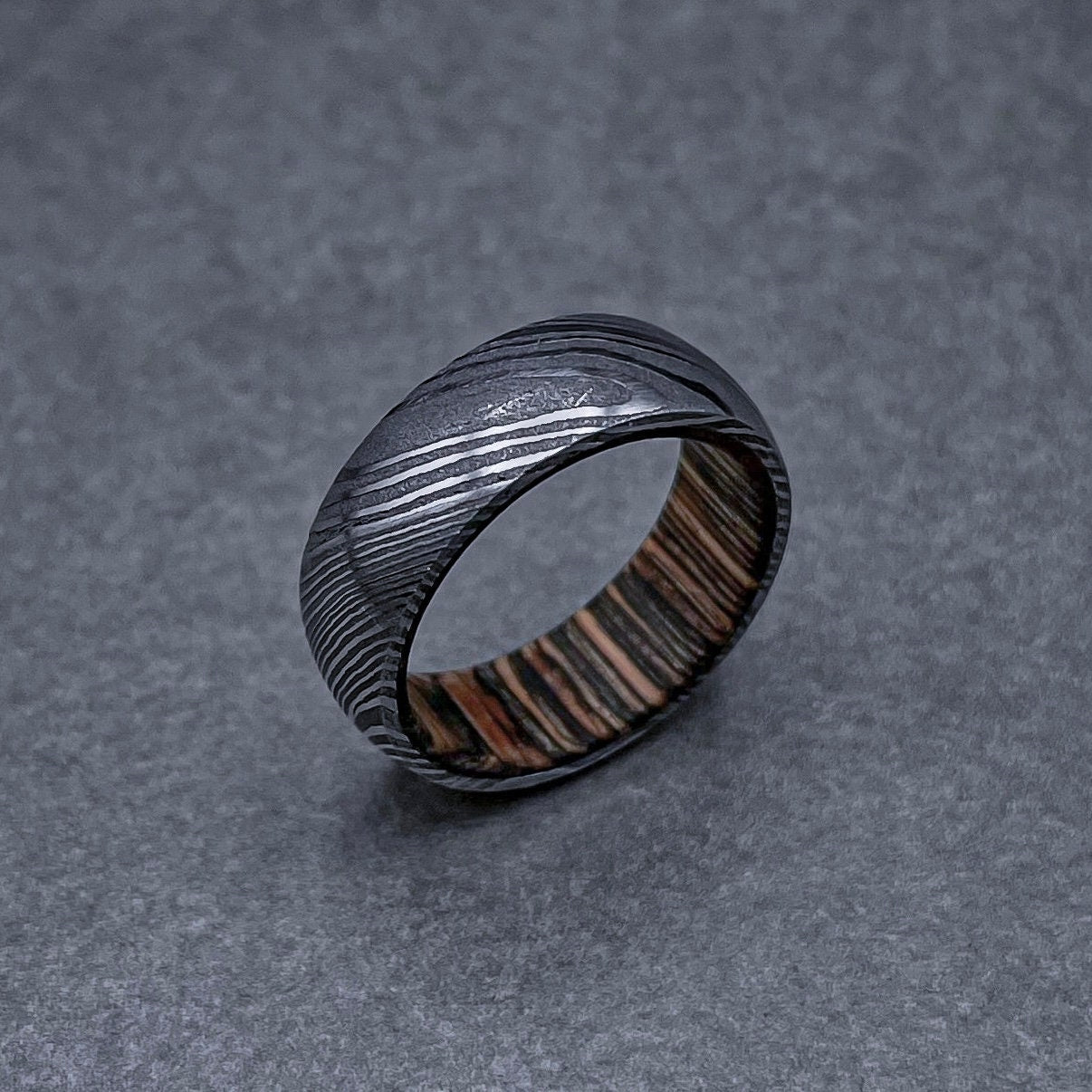 This Damascus steel band has an acid finish and the interior of the ring is lined with a hardwood sleeve. Hardwood rings are a beautiful combination of natural cut hardwood and custom formed alternative metal. If you're searching for a simple option, this wedding band offers a unique but simplistic aesthetic. The appealing design has an acid finish and the sterling hardwood sleeve adds a little extra pop.