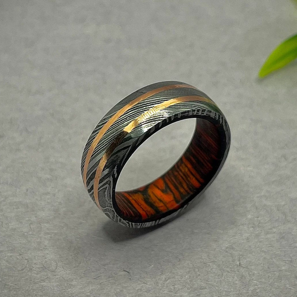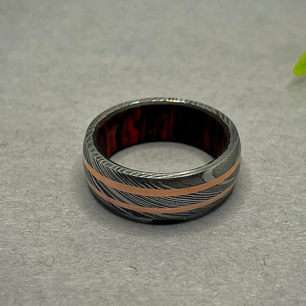 Handcrafted Damascus Steel & double Copper Inlay Ring – Unique Men&