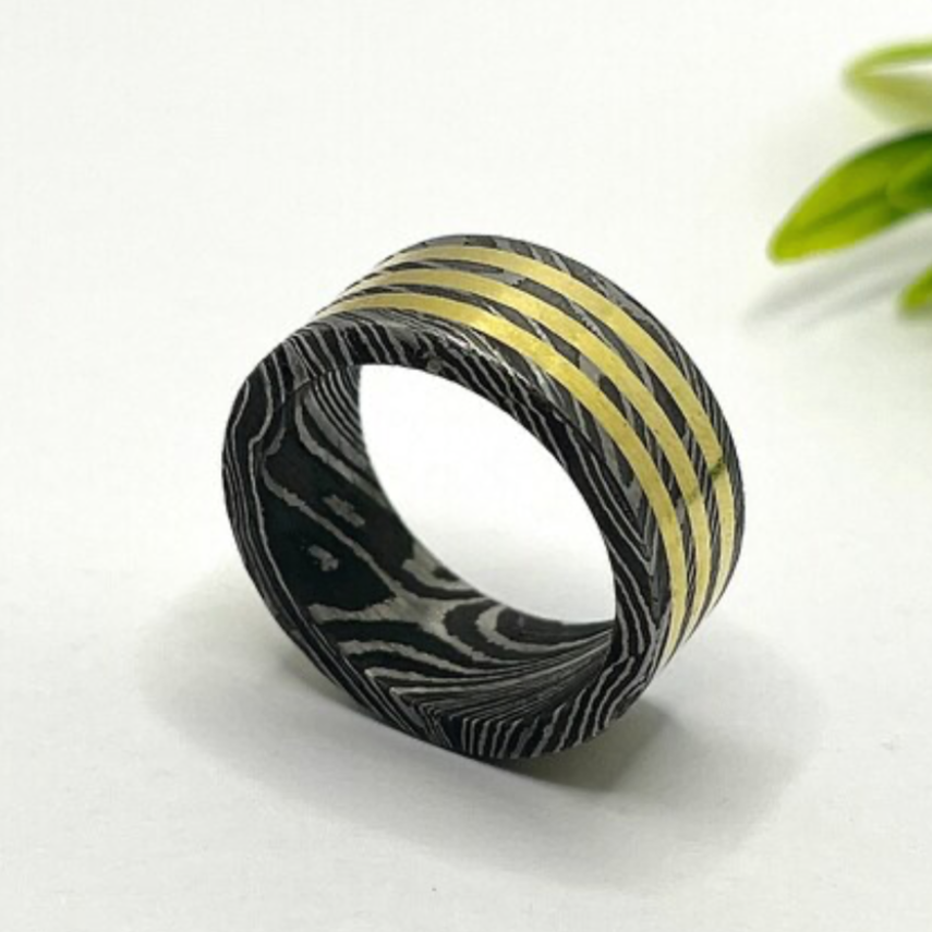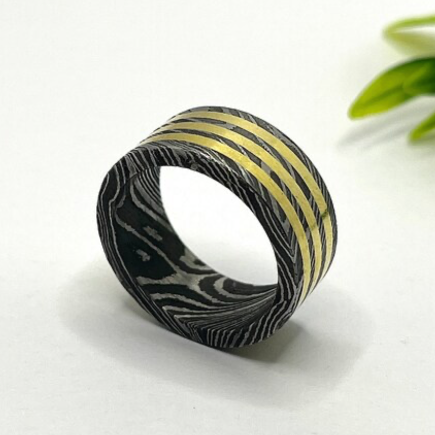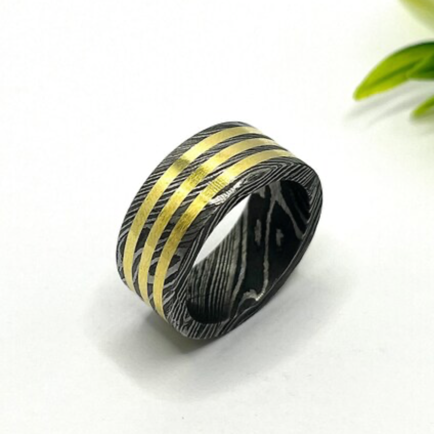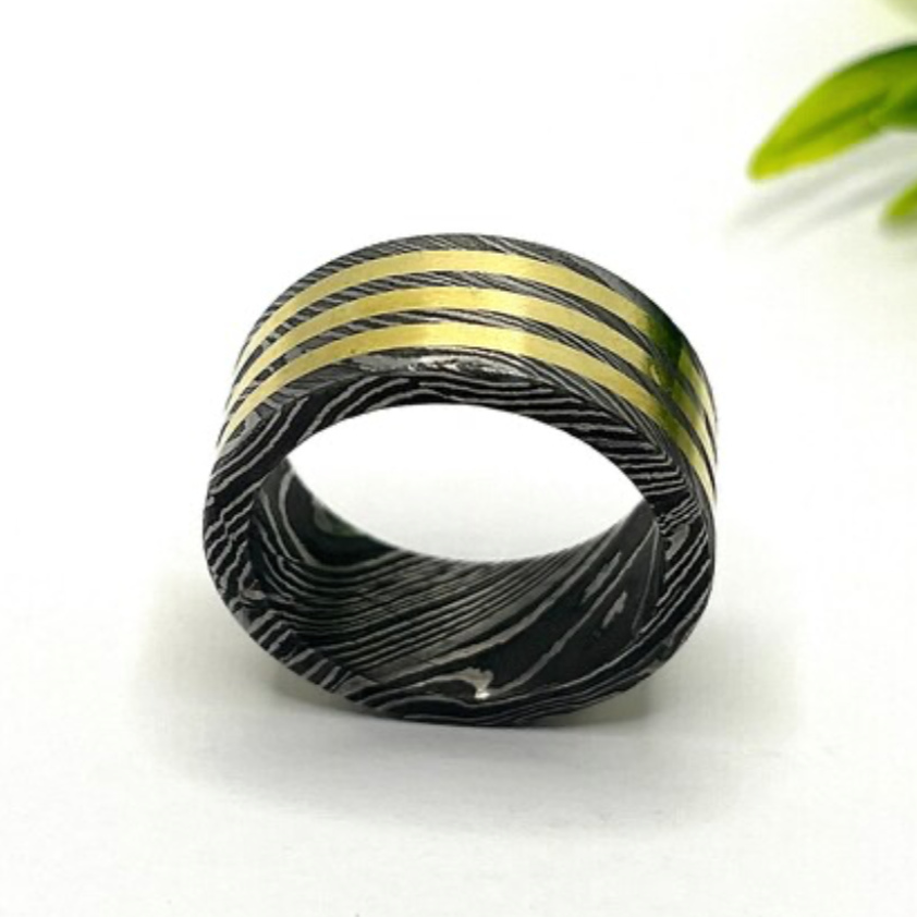 Looking for a distinctive men’s wedding band that blends power, elegance, and craftsmanship? 💍 This handcrafted Damascus Steel & Whiskey Barrel Wood Ring with a bold Triple Inlay Design is the perfect match. Featuring eye-catching ✨ gold-toned triple inlays set against rugged, wave-patterned Damascus steel, this ring offers a unique fusion of strength and sophisticated design.