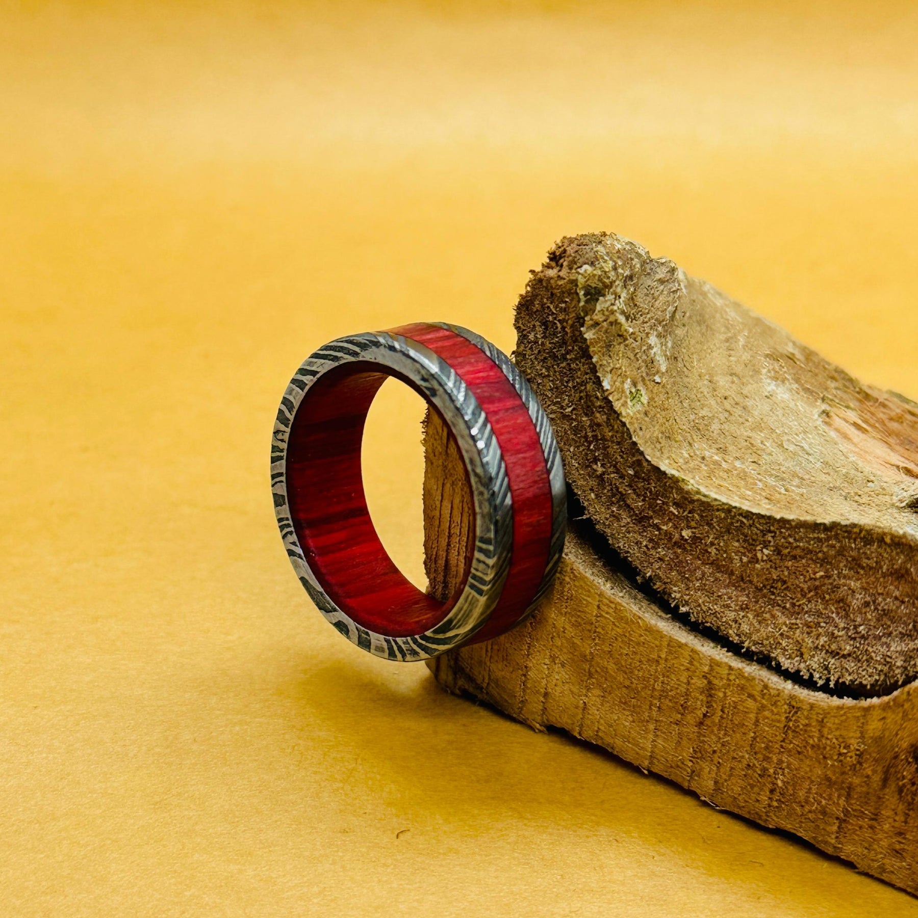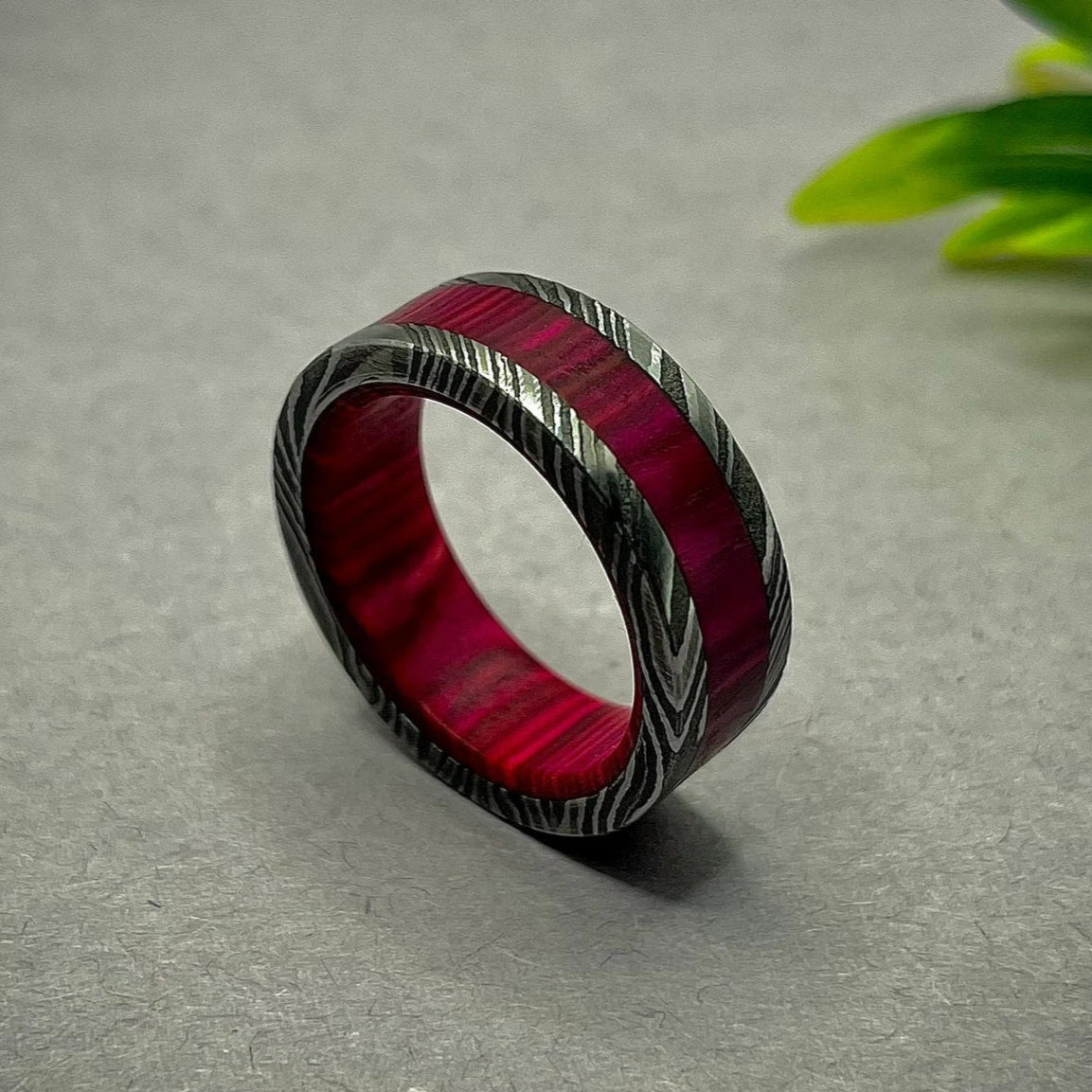 Handmade Damascus Steel Wedding Band | 8mm Minimalist Men’s Ring | Unique Anniversary & Groomsmen Gift | Pakkawood Inlay - RustyStudioUSA