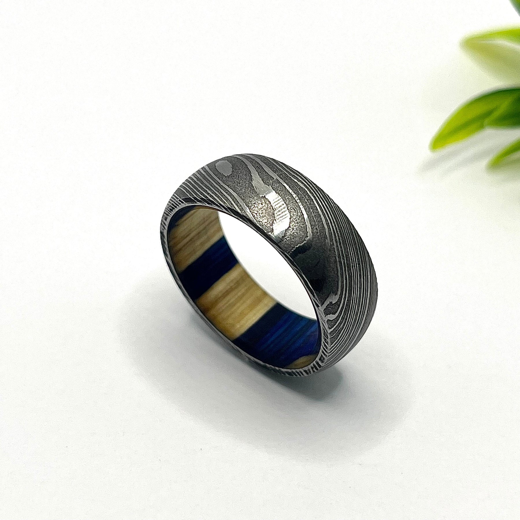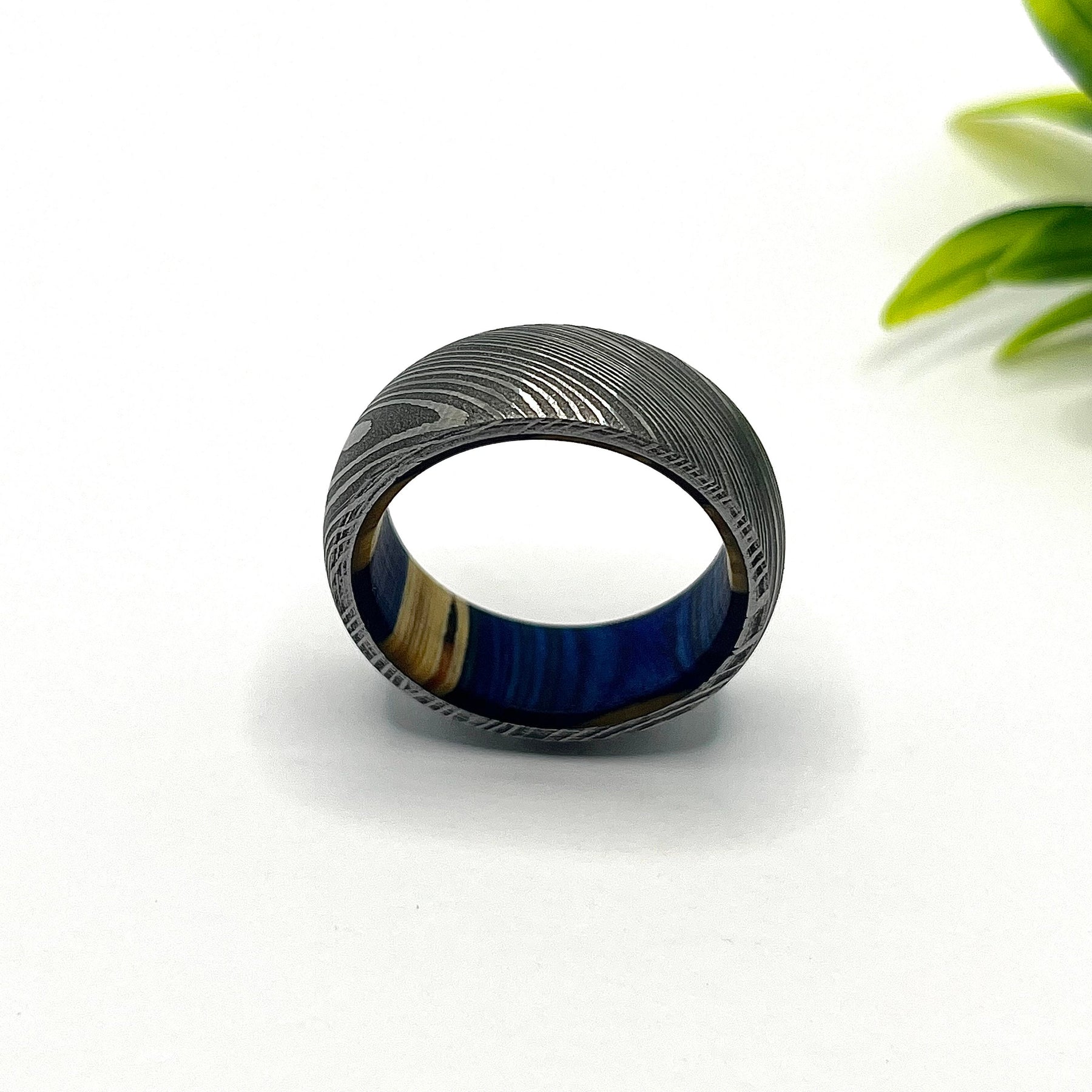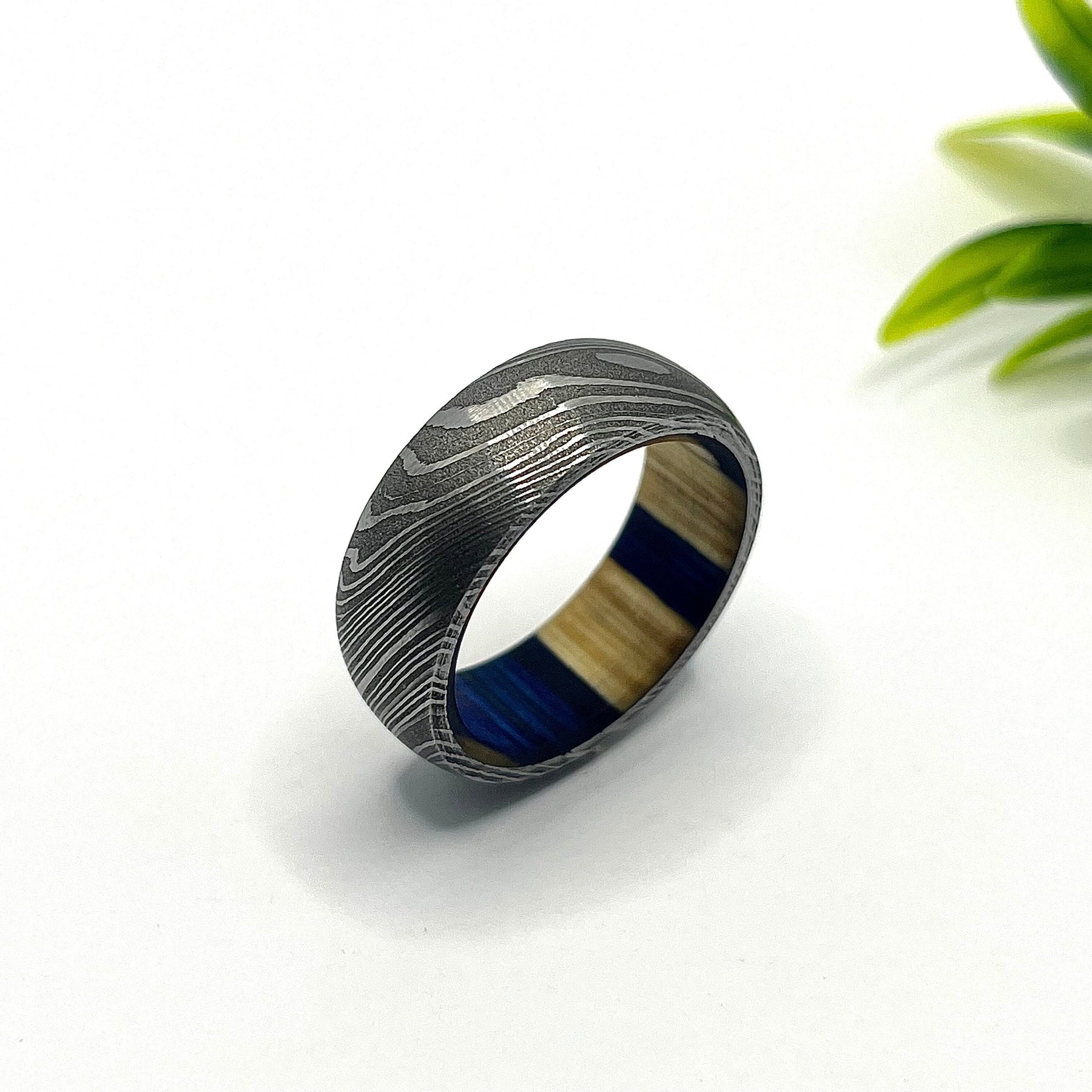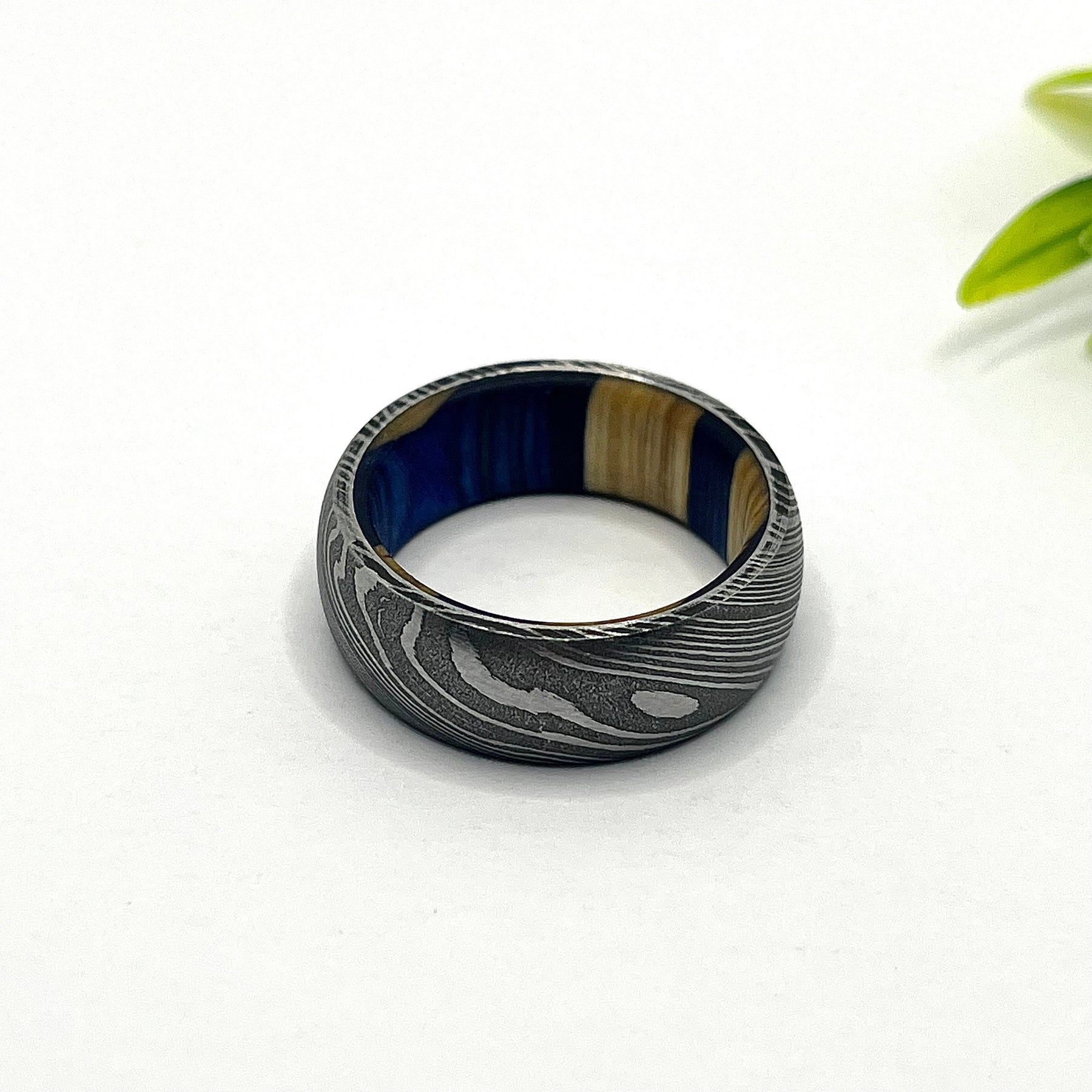 With its exquisite combination of Damascus steel and two-color sleeve wood, this ring is a true work of art. It's not just a piece of jewelry, but a symbol of your unique style and individuality. So why settle for an ordinary ring when you can have this stunning Damascus steel ring with a two-color sleeve wood? Order yours today and experience the unbeatable combination of style, durability, and craftsmanship.