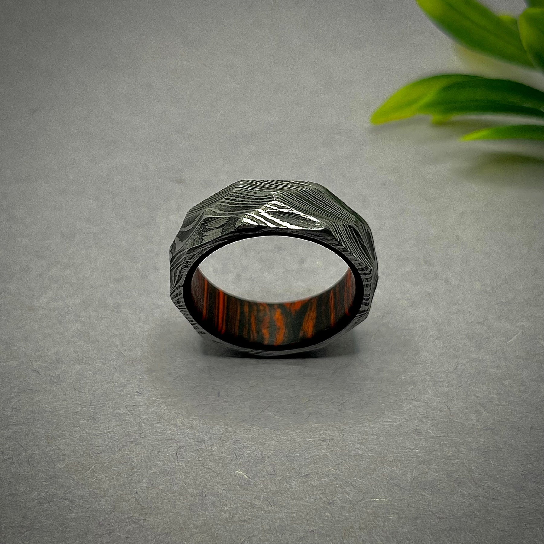 A premium & unique ring made of expensive Damascus steel. The interior of the ring is lined with a hardwood sleeve. Hardwood rings are a beautiful combination of natural cut hardwood and custom formed alternative metal. If you’re searching for a simple option, this band offers a unique but simplistic aesthetic. The appealing design has a sleek polished finish and the sterling hammered look adds a little extra pop.