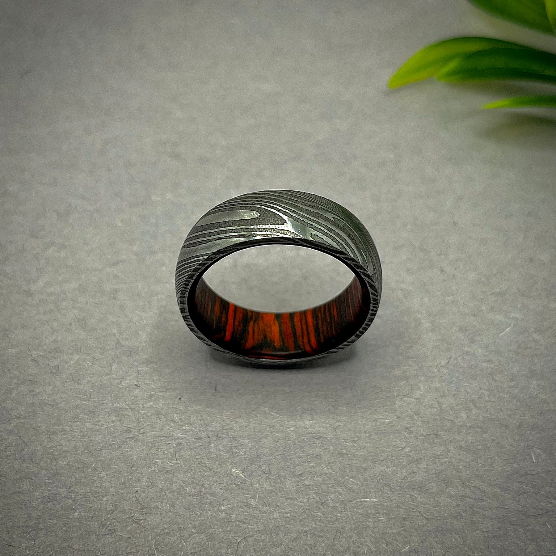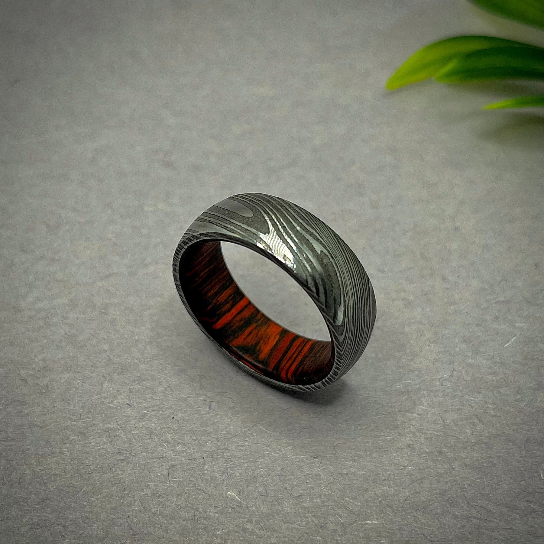 A premium & unique ring made of expensive Damascus steel. The interior of the ring is lined with a hardwood sleeve. Hardwood rings are a beautiful combination of natural cut hardwood and custom formed alternative metal. If you’re searching for a simple option, this band offers a unique but simplistic aesthetic. The appealing design has a sleek polished finish.