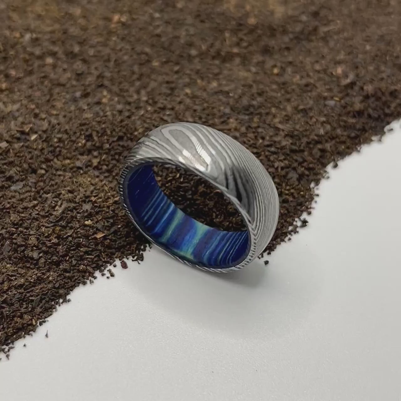 The interior of this damascus steel ring is lined with a hardwood sleeve. Hardwood used in this ring is 100% natural and skin friendly. If you want a ring that will stand out, this band is your one stop shop because it offers a unique but simplistic aesthetic. The appealing design has a sleek polished finish.
