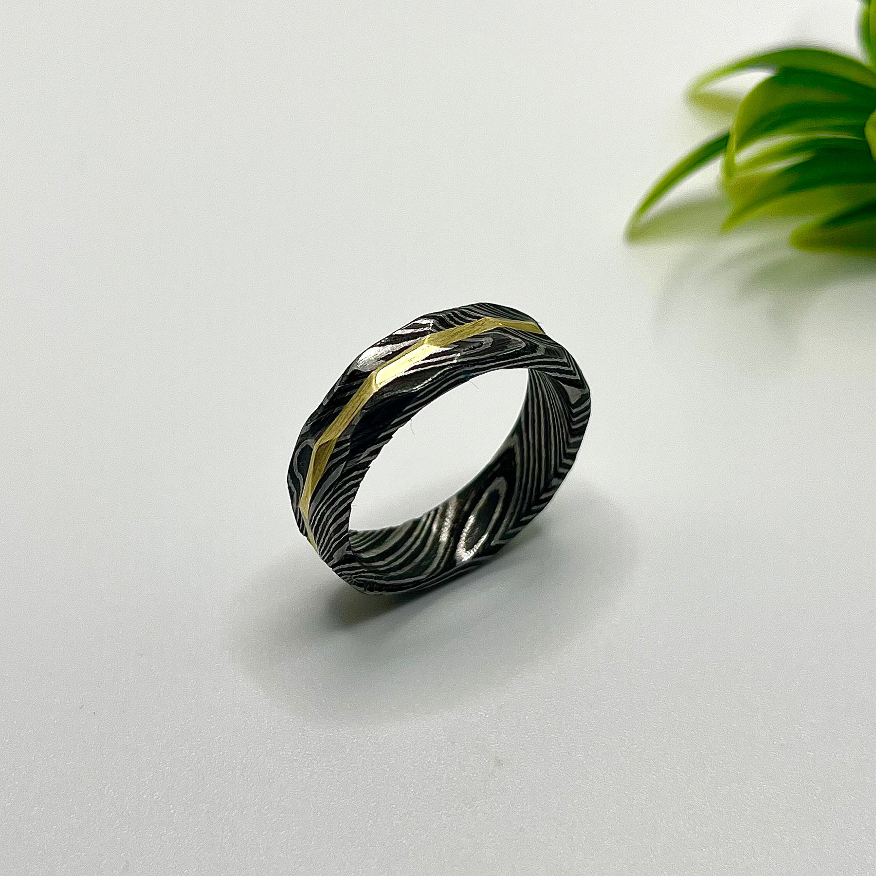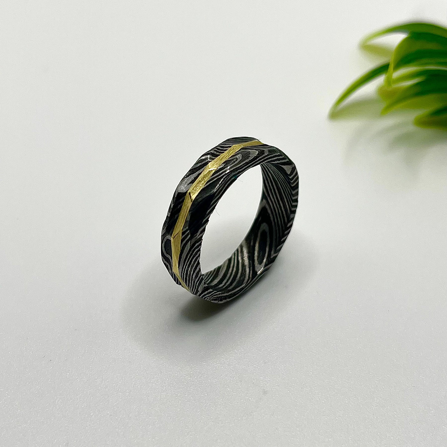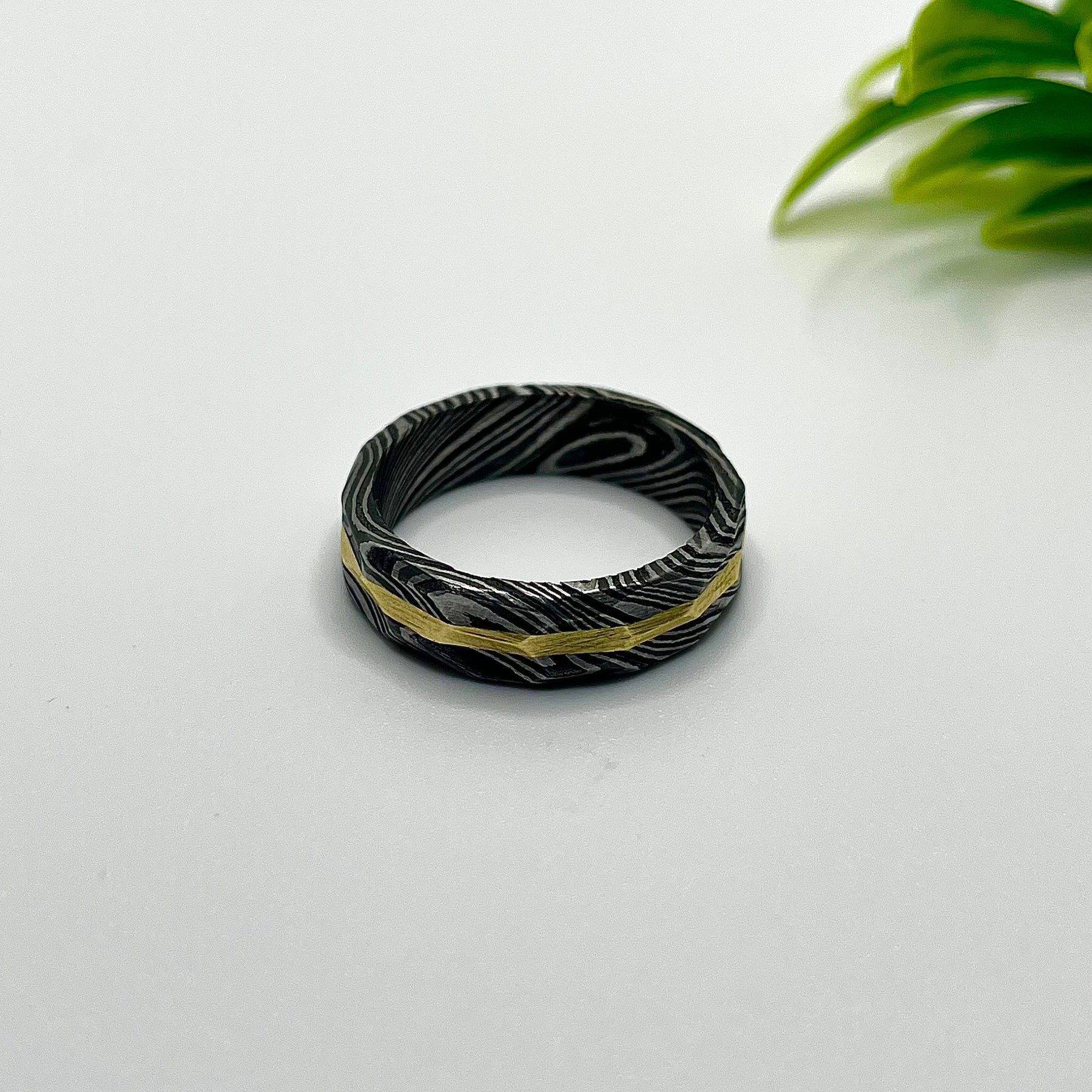A premium & unique ring made of expensive Damascus steel. The inlay of the ring is lined with a brass . Our rings are a beautiful combination of natural cut brass and custom formed alternative metal. If you’re searching for a simple option, this band offers a unique but simplistic aesthetic. The appealing design has a sleek polished finish.